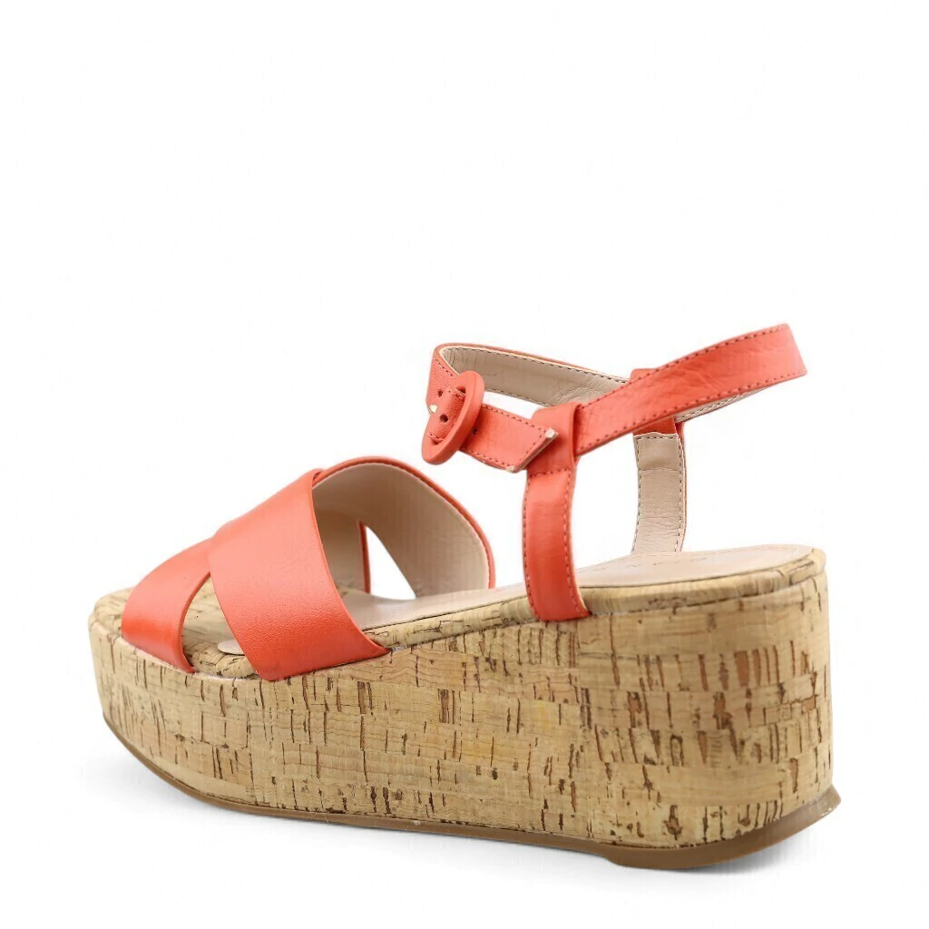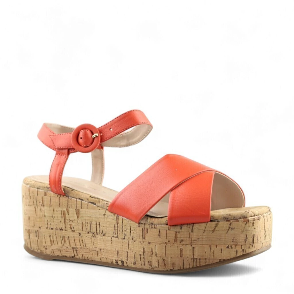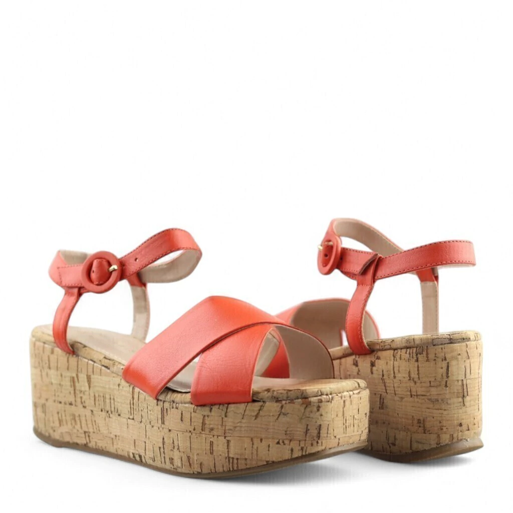 Descrição: A imagem apresenta um par de sandálias de salto plataforma com um design vibrante e moderno. As tiras são de couro em um tom laranja intenso, que traz um visual alegre e contemporâneo.