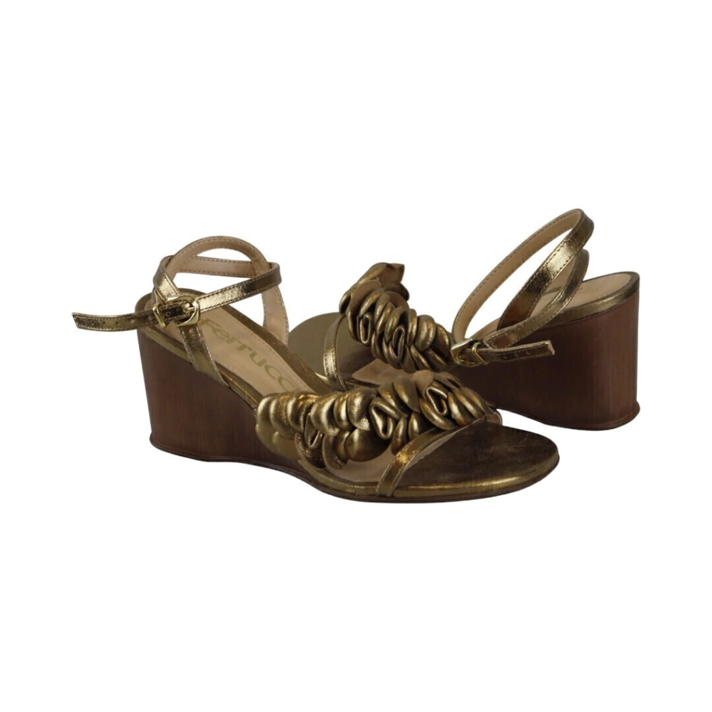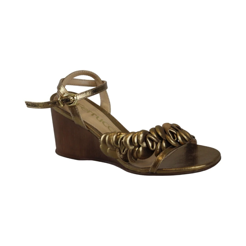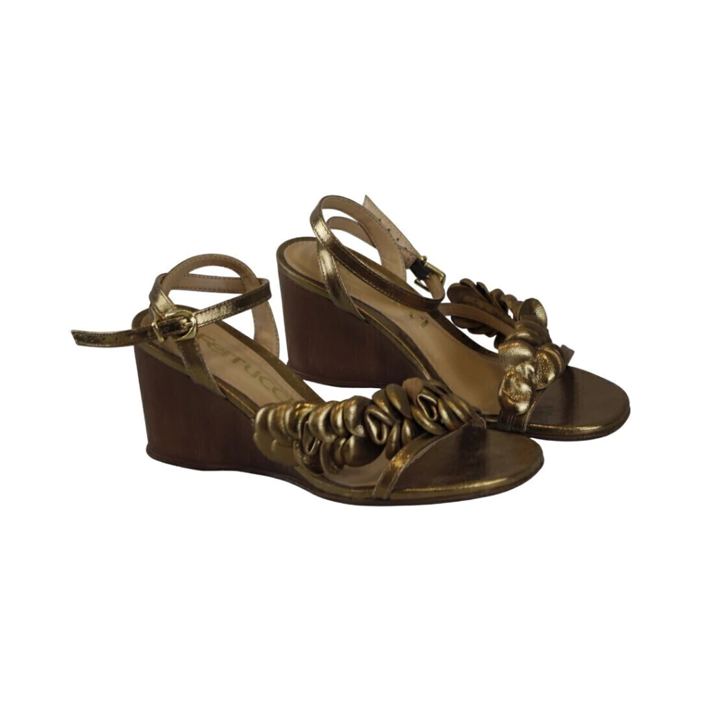 DESCRIÇÃO:Sandália feminina anabela em tom bronze/dourado metalizado com acabamento acetinado. Bico aberto e cabedal frontal composto por uma tira única decorada com aplicações franzidas/rodadas que formam efeito de flor/volumoso. Tira de tornozelo fina com fivela dourada ajustável. Plataforma/solado anabela em acabamento que imita madeira, com salto médio que oferece estabilidade. Palmilha levemente acolchoada em tom nude. Visual elegante e feminino, ideal para looks de festa ou dia a dia mais arrumado.