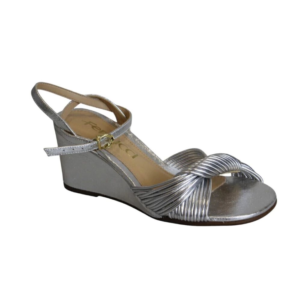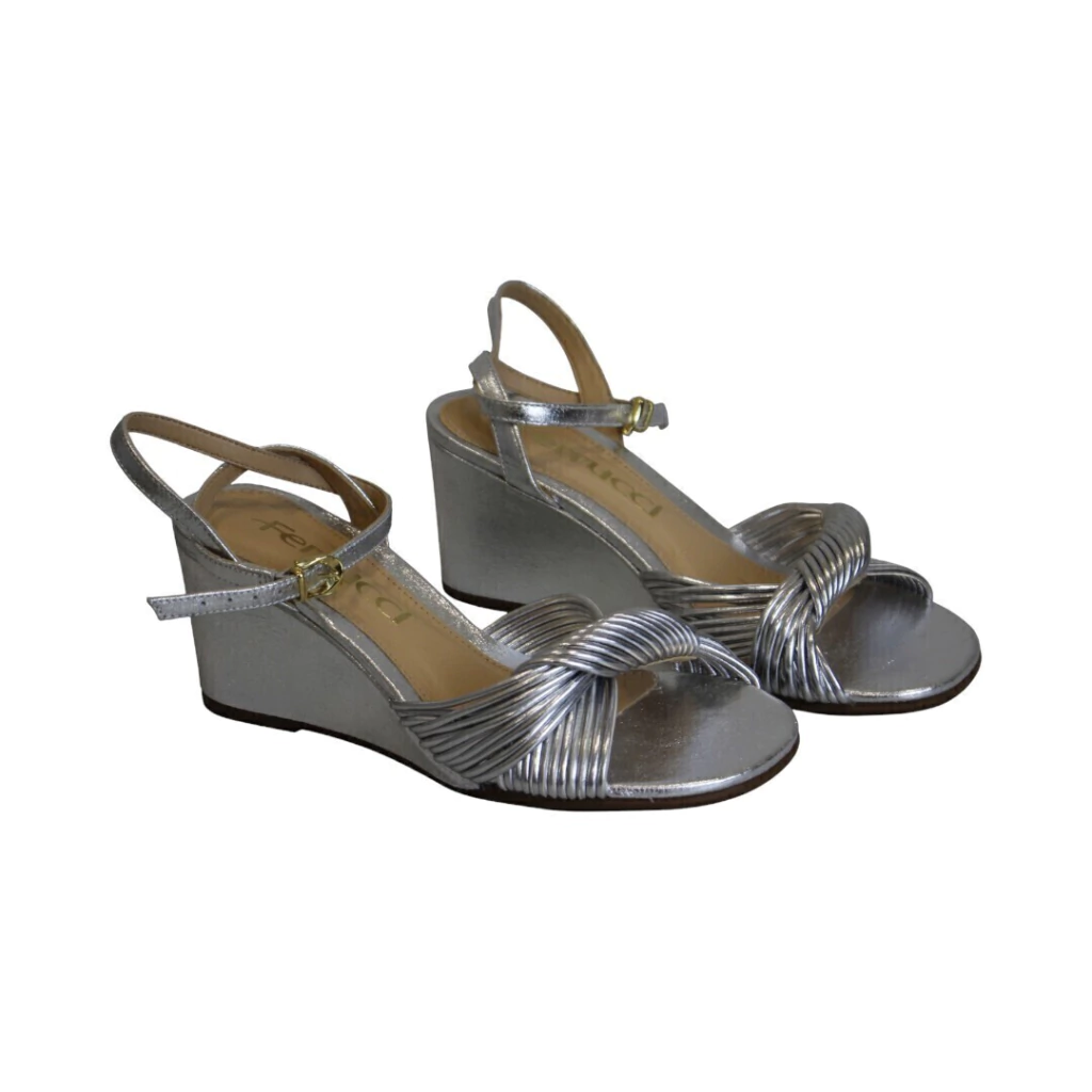 DESCRIÇÃO:Sandália feminina anabela metalizada prateada com bico aberto. Cabedal formado por múltiplas tiras finas entrelaçadas em nó central sobre o peito do pé, criando efeito texturizado e delicado. Tira traseira tipo slingback com fivela dourada ajustável no tornozelo. Plataforma anabela média revestida na mesma cor prateada, palmilha nude levemente acolchoada. Visual sofisticado e versátil, ideal para eventos e looks festivos.