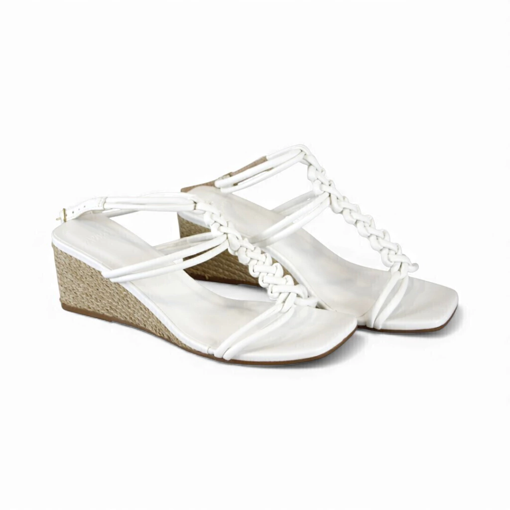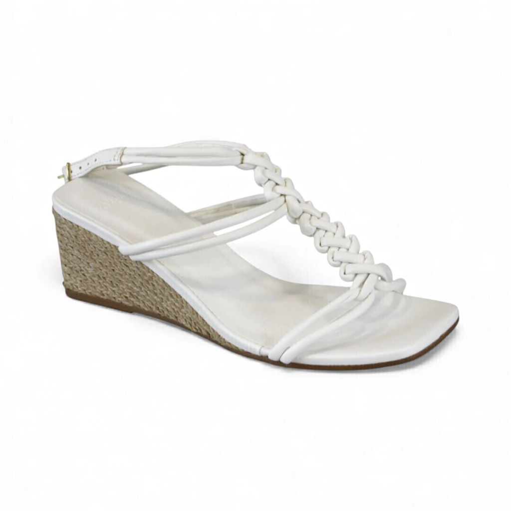 DESCRIÇÃO: Sandália feminina branca com salto anabela médio revestido em textura tipo ráfia (estilo espadrille). Cabedal formado por tiras finas: duas laterais sobre o peito do pé e uma tira central trançada que sobe até o tornozelo. Tira sling no calcanhar com fivela metálica ajustável. Palmilha no mesmo tom branco, bico levemente quadrado e acabamento liso nas tiras.