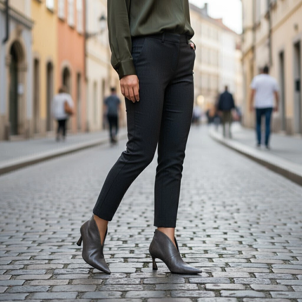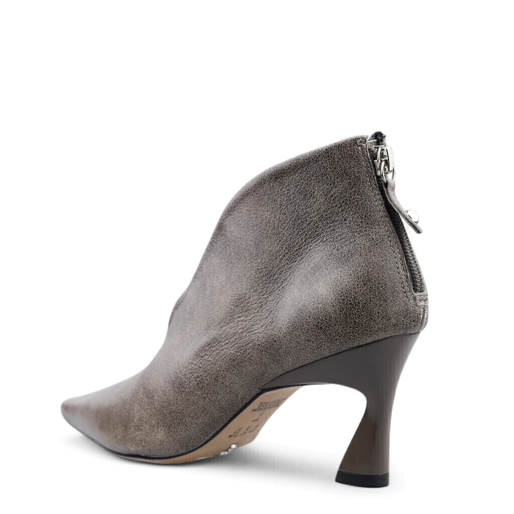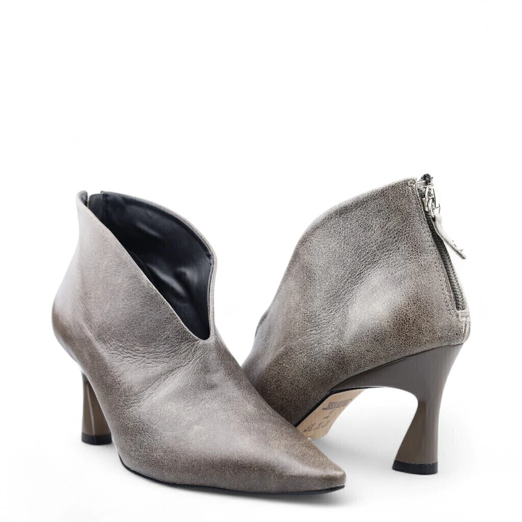 Descrição: Esse bota de salto apresenta um design sofisticado e moderno, confeccionada em couro cinza com um acabamento suave. O modelo é de bico fino e possui um corte assimétrico na parte superior, que confere um toque contemporâneo.