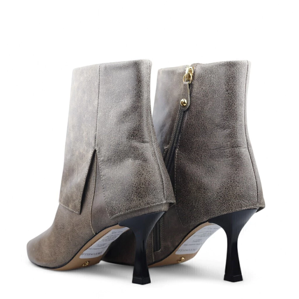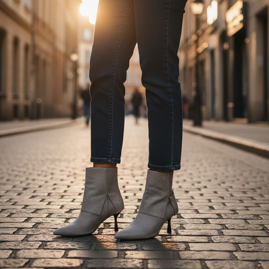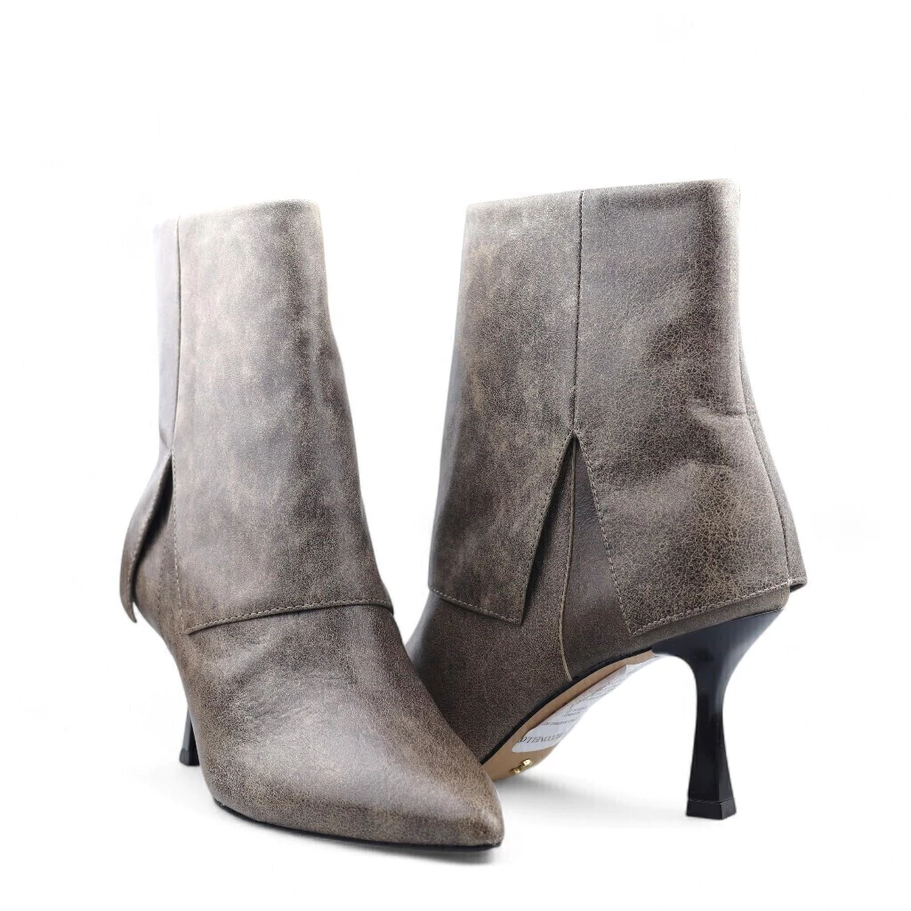 Descrição: A imagem apresenta uma bota de cano curto em um tom cinza suave, confeccionada em material com acabamento texturizado. O design é contemporâneo e elegante, com um bico afilado que confere um toque moderno. A parte superior da bota conta com um detalhe de recorte que adiciona um elemento interessante ao visual. O salto é fino e de altura média, proporcionando um toque de sofisticação ao mesmo tempo que garante conforto. Esta bota é ideal para compor looks versáteis, sendo uma excelente escolha para o outono e inverno, perfeita para diversas ocasiões, desde eventos casuais até mais formais.