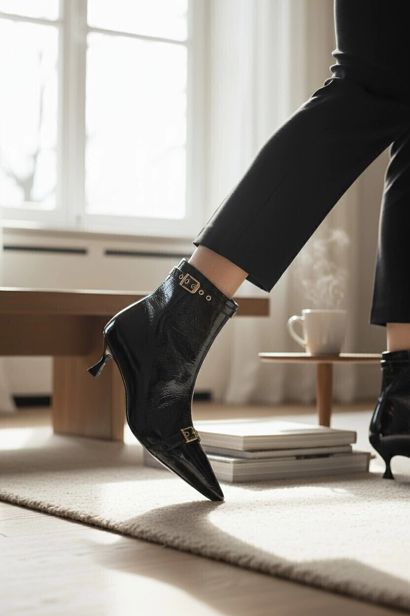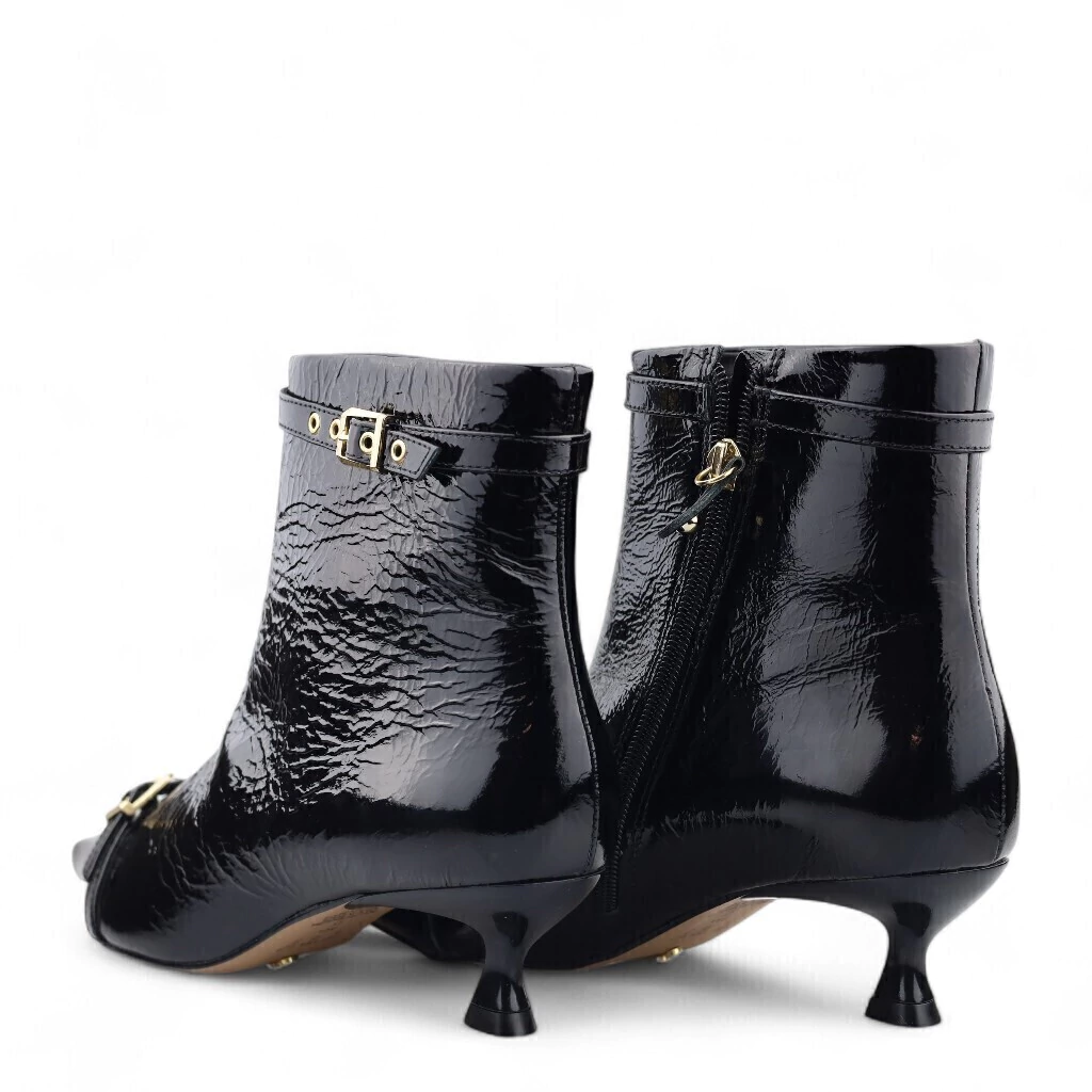 Descrição: A imagem mostra uma bota de cano curto em um acabamento brilhante, na cor preta. O design é sofisticado e moderno, com um bico afilado que adiciona um toque contemporâneo. O detalhe de fivela dourada na parte superior e na parte frontal da bota oferece um contraste elegante, elevando o estilo do modelo. O salto é pequeno e delicado, proporcionando conforto e praticidade. A textura da bota apresenta um leve efeito craquelado, que adiciona profundidade ao visual. Esta bota é perfeita para compor looks ousados e elegantes, ideal para diversas ocasiões.