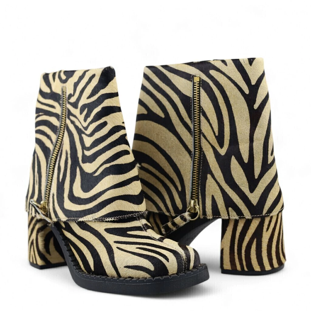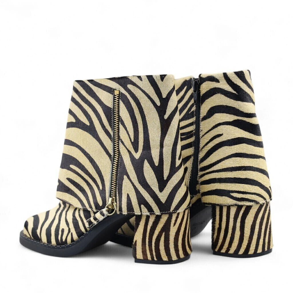 DESCRIÇÃO: A imagem mostra uma bota de cano curto com um design ousado e marcante, revestida em material que imita pele de animal, com padrão de zebra em tons de bege e preto. O estilo é arrojado, ideal para quem busca um toque de personalidade no visual.