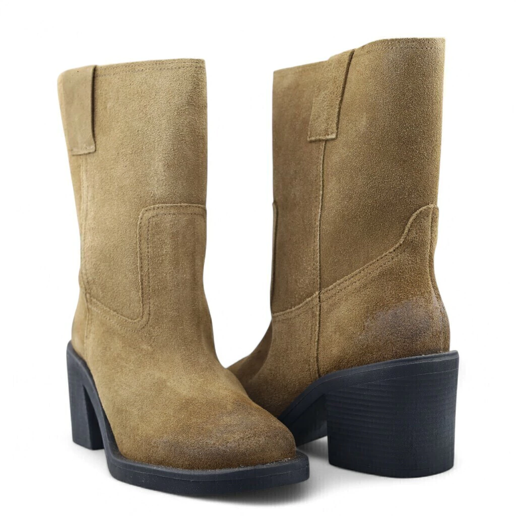 DESCRIÇÃO: A imagem mostra uma bota de cano curto em um tom terroso, com acabamento em camurça que confere uma textura suave e aconchegante. O design é minimalista, com linhas limpas e sem muitos detalhes, o que a torna bastante versátil.