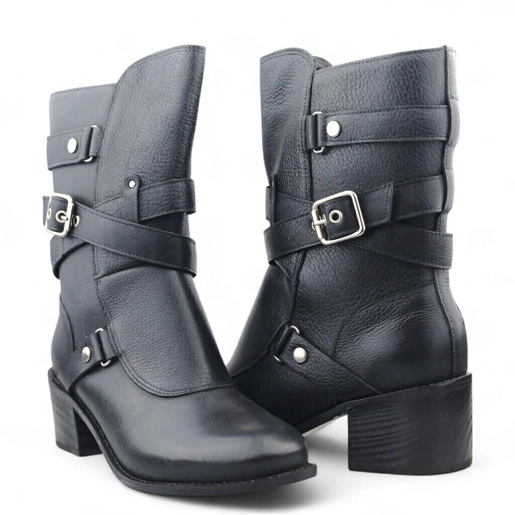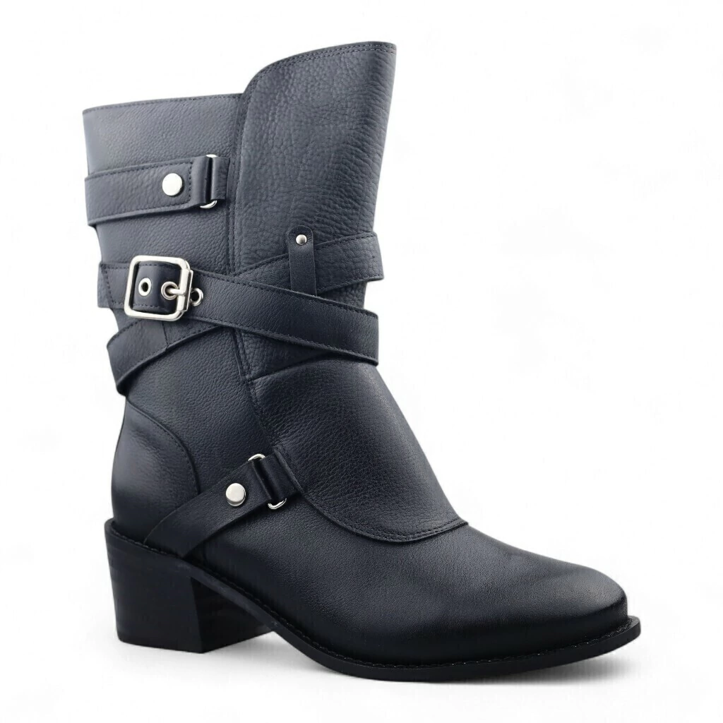 DESCRIÇÃO: A imagem apresenta uma bota de cano curto em um acabamento preto, com um design inspirado no estilo country e western. A parte superior é levemente elevada e possui detalhes de fivelas e tiras que cruzam a bota, adicionando um toque de estilo e sofisticação.