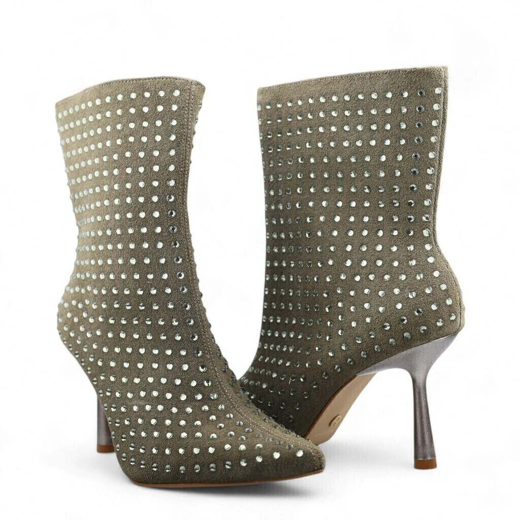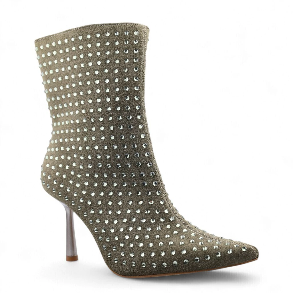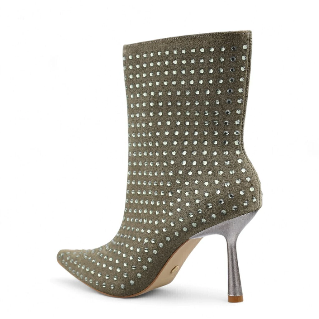 DESCRIÇÃO: A imagem apresenta uma bota de cano curto em um tom verde oliva, com um acabamento que lembra camurça. O destaque do modelo são os detalhes em strass brilhantes, que estão dispostos de maneira uniforme ao longo da superfície, conferindo um efeito glamouroso e atraente.