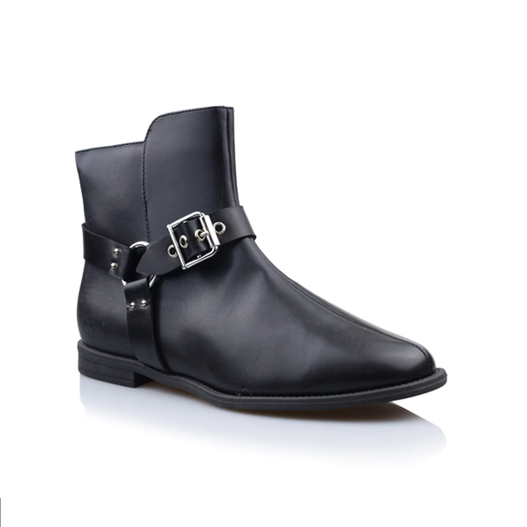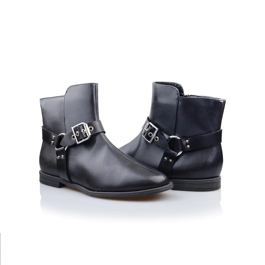 DESCRIÇÃO: A imagem mostra uma bota feminina de cano curto em couro preto, com um design elegante e sofisticado. O modelo apresenta uma fivela prateada lateral, que adiciona um detalhe moderno e estiloso.