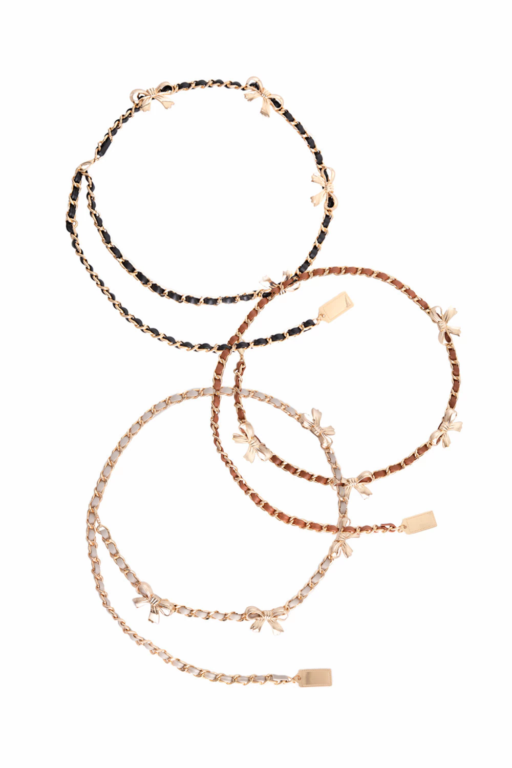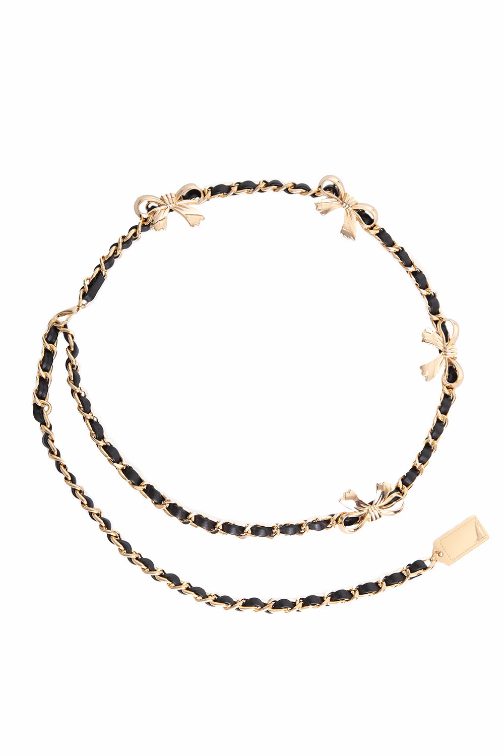 Cintom em corrente metal dourado com tira de couro sintético preta entrelaçada pelos elos. Quatro laços metálicos dourados como aplicações espaçadas ao longo da peça e plaquinha retangular decorativa próxima à ponta. Fecho de mosquetão; acabamento brilhante — visual feminino, elegante e com toque vintage/chic.