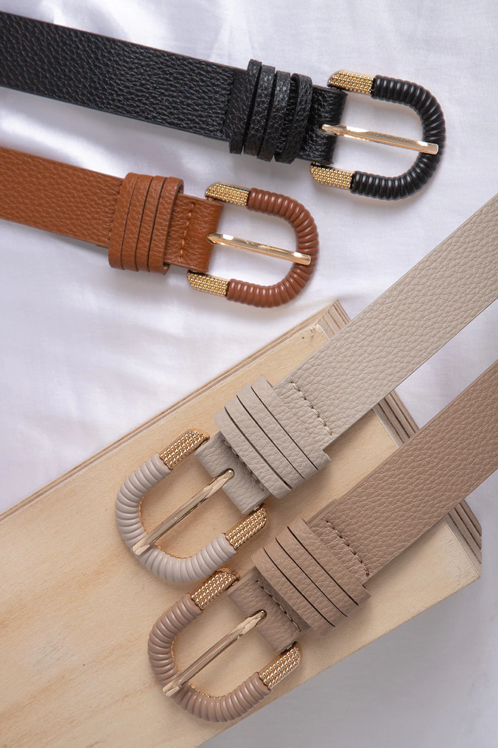 Cinto em couro sintético/texturizado preto com largura média. Fivela em metal dourado em formato arredondado (U), com acabamento envolto por uma faixa preta texturizada/ripada nas laterais e detalhes dourados texturizados nas extremidades. Três passadores/argolas próximas à fivela feitos do mesmo material do cinto; pontas arredondadas e ilhós de ajuste visíveis. Visual contemporâneo com toque sofisticado e ligeiro contraste entre o preto e o dourado.
