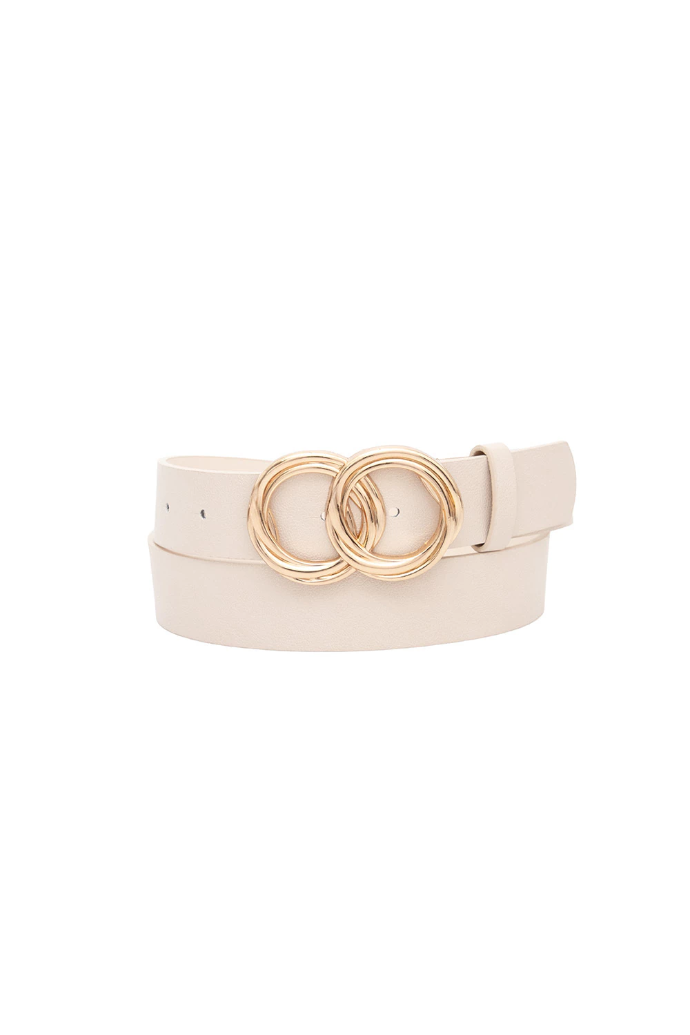 Cinto em material sintético na cor off-white/creme com acabamento liso e fosco. Fivela dupla decorativa em metal dourado formada por dois anéis entrelaçados; passador na mesma cor do cinto e ilhós de ajuste. Visual clean, elegante e versátil.