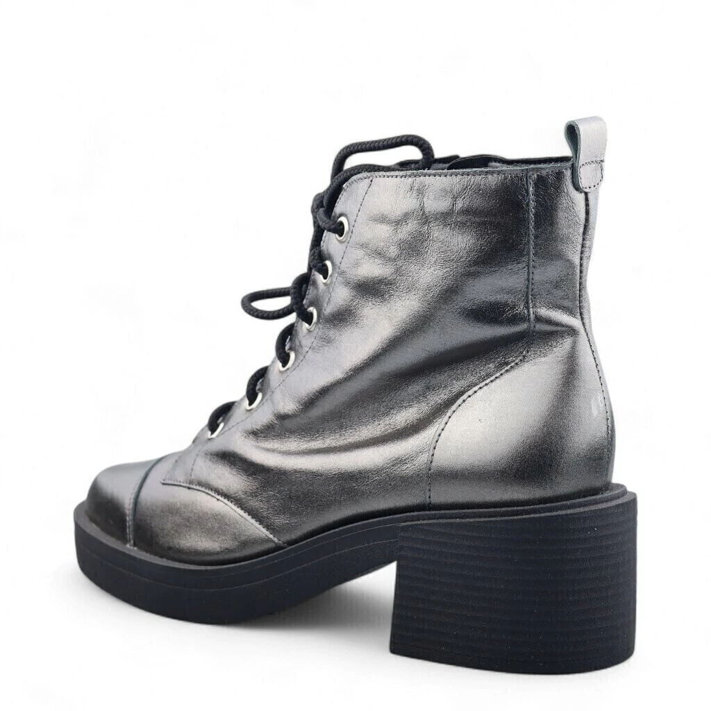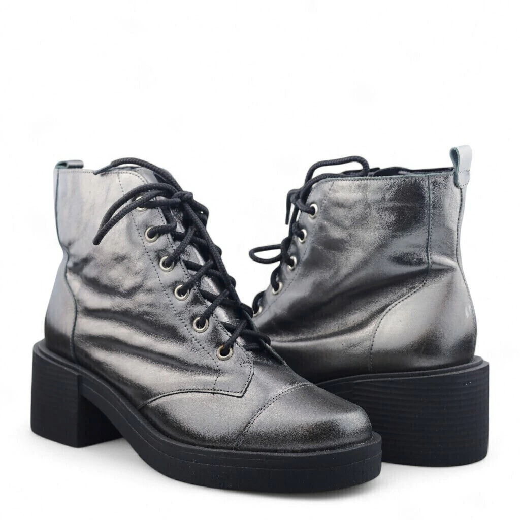 DESCRIÇÃO: As imagens mostram um par de botas de cano médio em tom metálico prateado. Com bico arredondado e solado de plataforma, oferecem conforto e estabilidade. O fechamento é feito por cadarços frontais, permitindo ajuste personalizado, e o salto grosso garante elevação sem comprometer o conforto. O acabamento brilhante adiciona sofisticação ao modelo, que é versátil para diversas ocasiões. O fundo branco realça os detalhes do design.