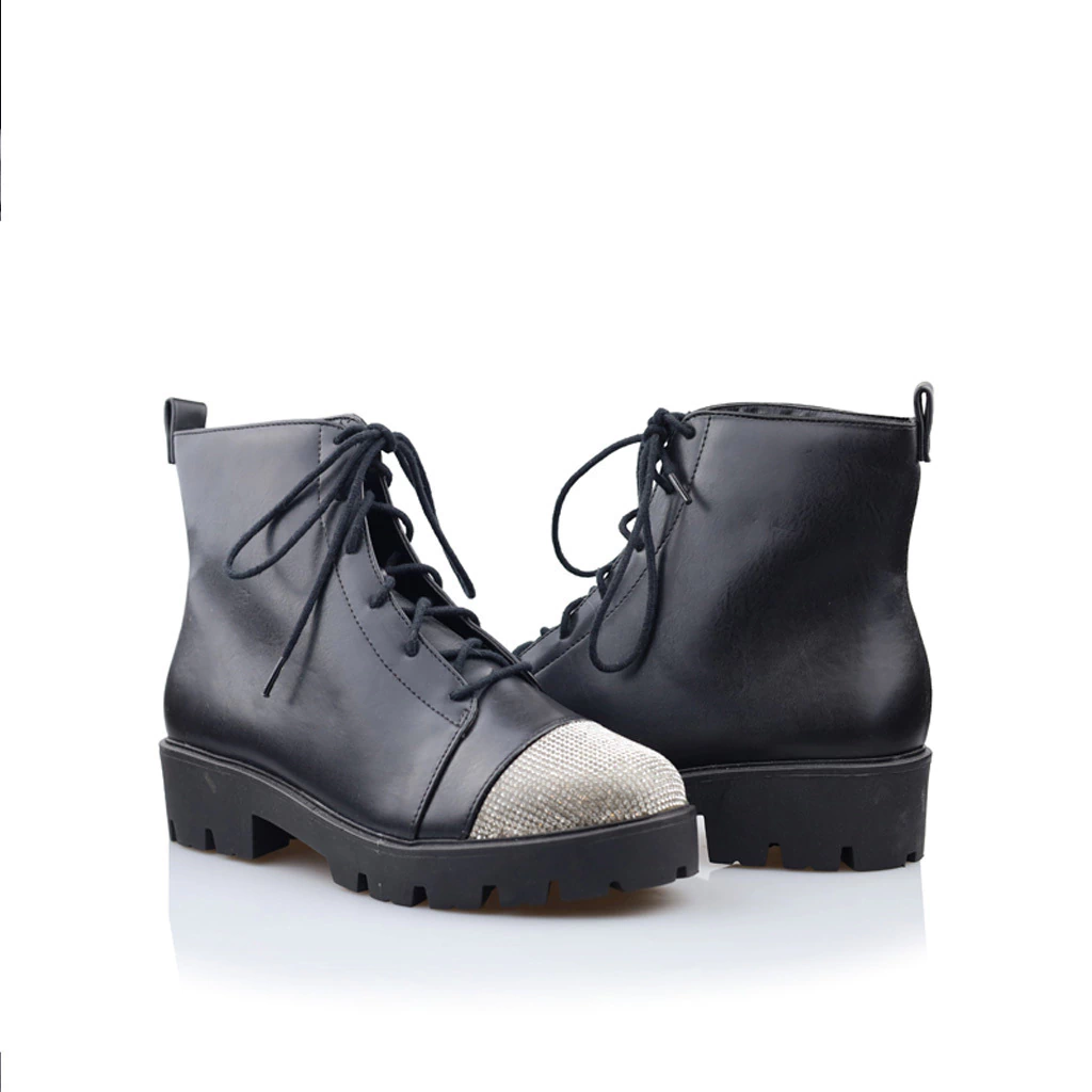 DESCRIÇÃO: A imagem mostra uma bota feminina de cano curto em preto, com um design moderno e ousado. O destaque do modelo é o bico revestido com detalhes brilhantes, que adiciona um toque de glamour e contraste ao visual.
