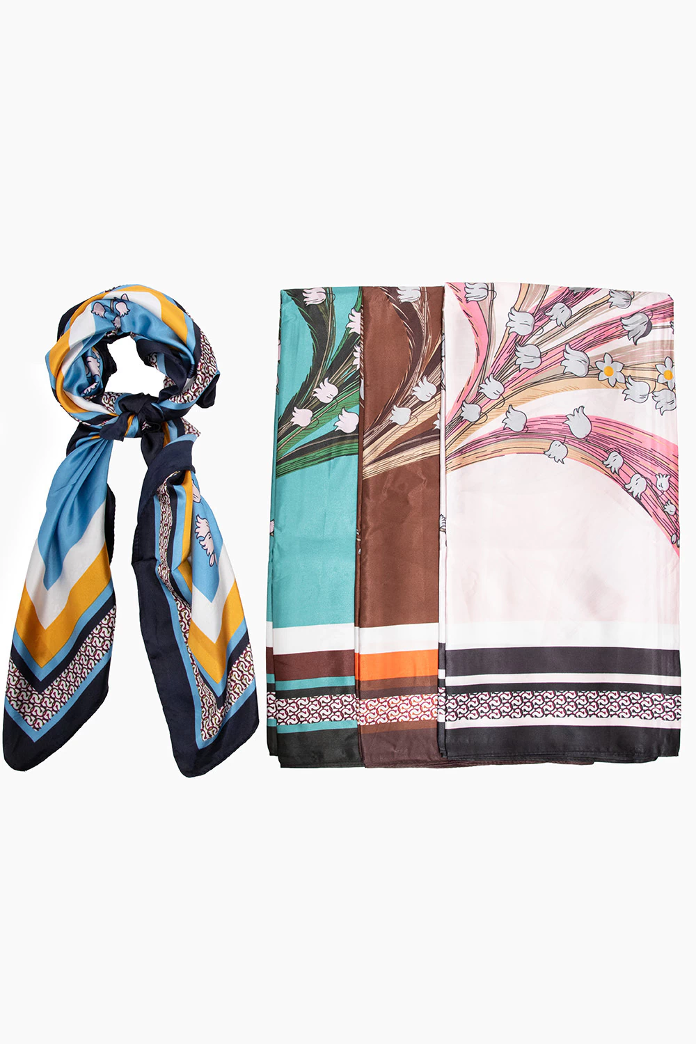 Lenço/bandana acetinado dobrado e amarrado em nó lateral. Predominância de verde-água com ramo floral delicado em rosa claro, faixas diagonais em branco, marrom e preto, e faixa interna com padrão geométrico repetido em vinho e branco. Borda preta, acabamento brilhante, formato triangular alongado — visual fresco e sofisticado.