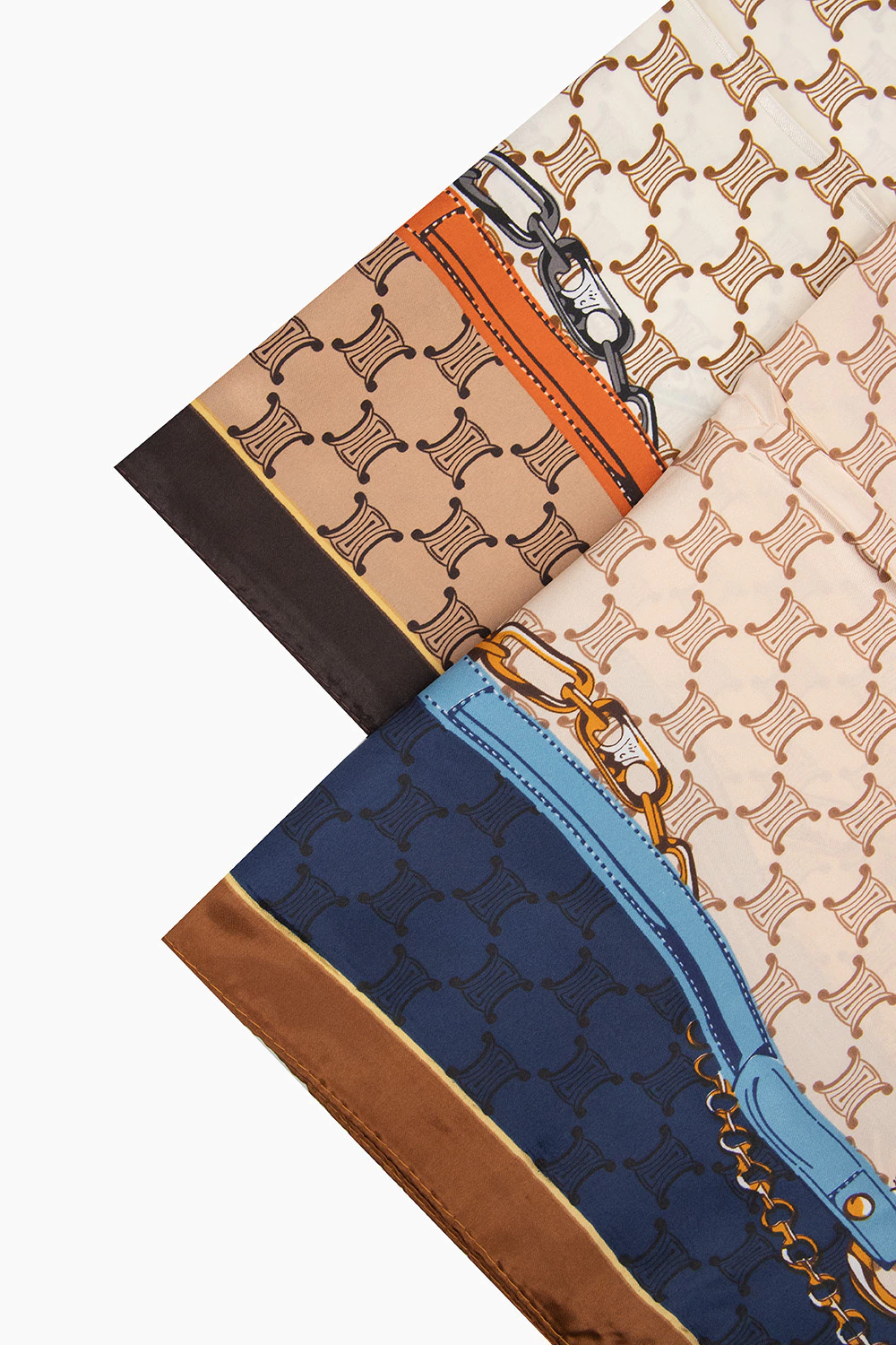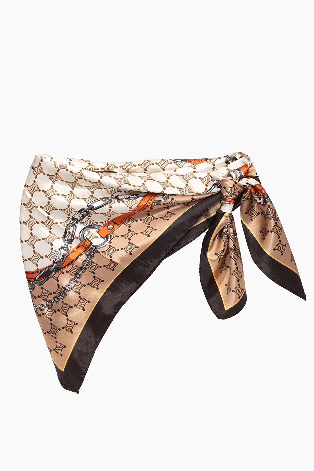 Lenço/bandana acetinado dobrado e amarrado em nó lateral. Fundo em tons creme e bege com padrão geométrico repetido; faixa inferior em marrom claro com borda preta e filete amarelo. Estampa com motivos equestres — correias/peças de couro em tom ferrugem-alaranjado e correntes metálicas — conferindo ar clássico e sofisticado. Acabamento brilhante, formato triangular alongado.
