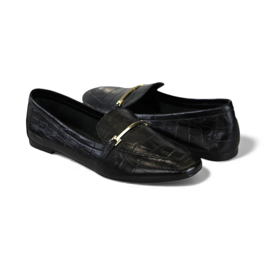 DESCRIÇÃO: Mocassim feminino preto com textura croco (aparente), bico levemente afunilado/quadrado. Detalhe frontal em metal dourado tipo fivela/torno; acabamento liso, palmilha levemente acolchoada e solado fino.
