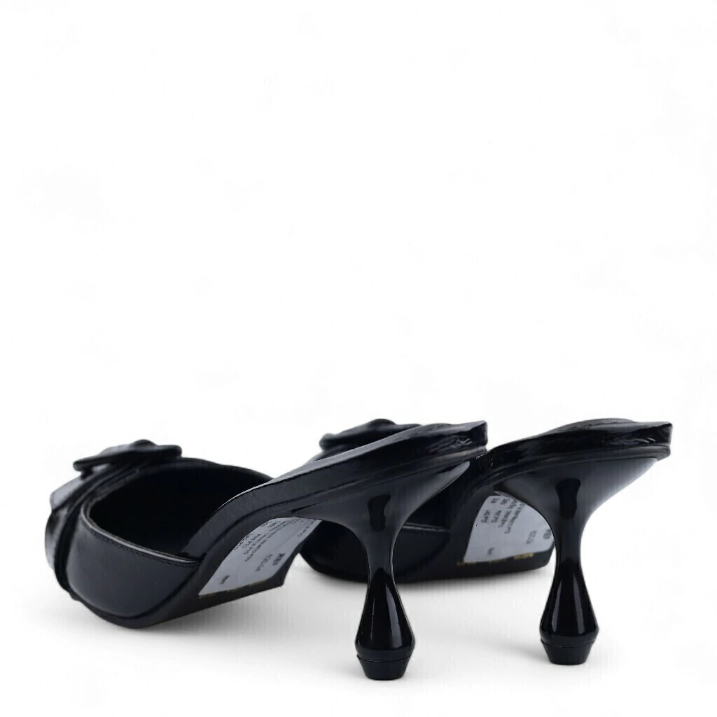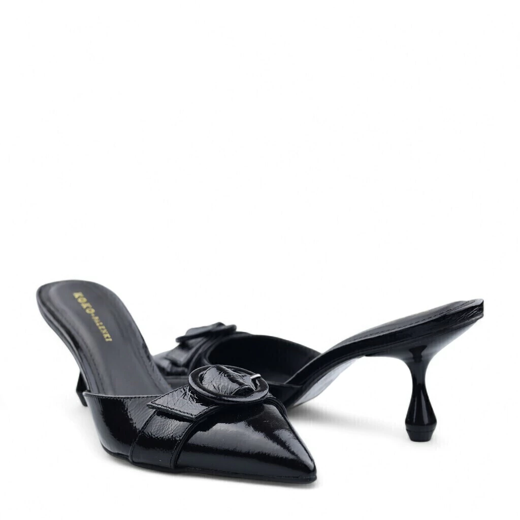 Descrição: A imagem apresenta um par de mules com salto agulha em um tom preto, com um acabamento brilhante que confere um aspecto sofisticado.