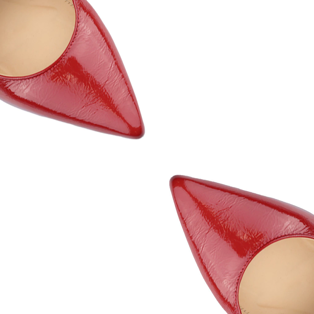 DESCRIÇÃO:A imagem mostra uma mule feminina em um vibrante tom de vermelho. O design apresenta um bico afunilado e um detalhe de laço na parte superior, que adiciona um toque de charme. A parte lateral tem um recorte que confere modernidade ao modelo.