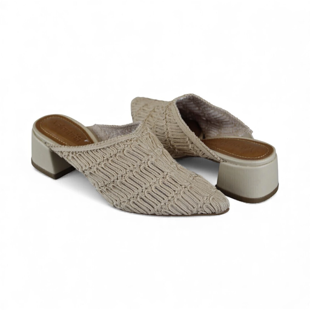 DESCRIÇÃO: Mule feminino em tom bege claro com bico levemente pontudo. Cabedal texturizado em trançado/macramê ou ponto tricot, de aparência artesanal e ventilada. Parte traseira aberta (sem calcanhar) e salto bloco de altura média em tom perolado/creme. Palmilha marrom com costura visível. Visual delicado, confortável e com toque artesanal.