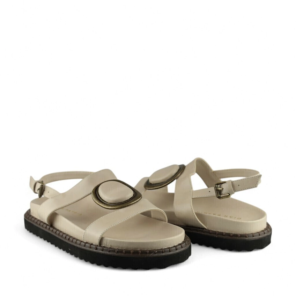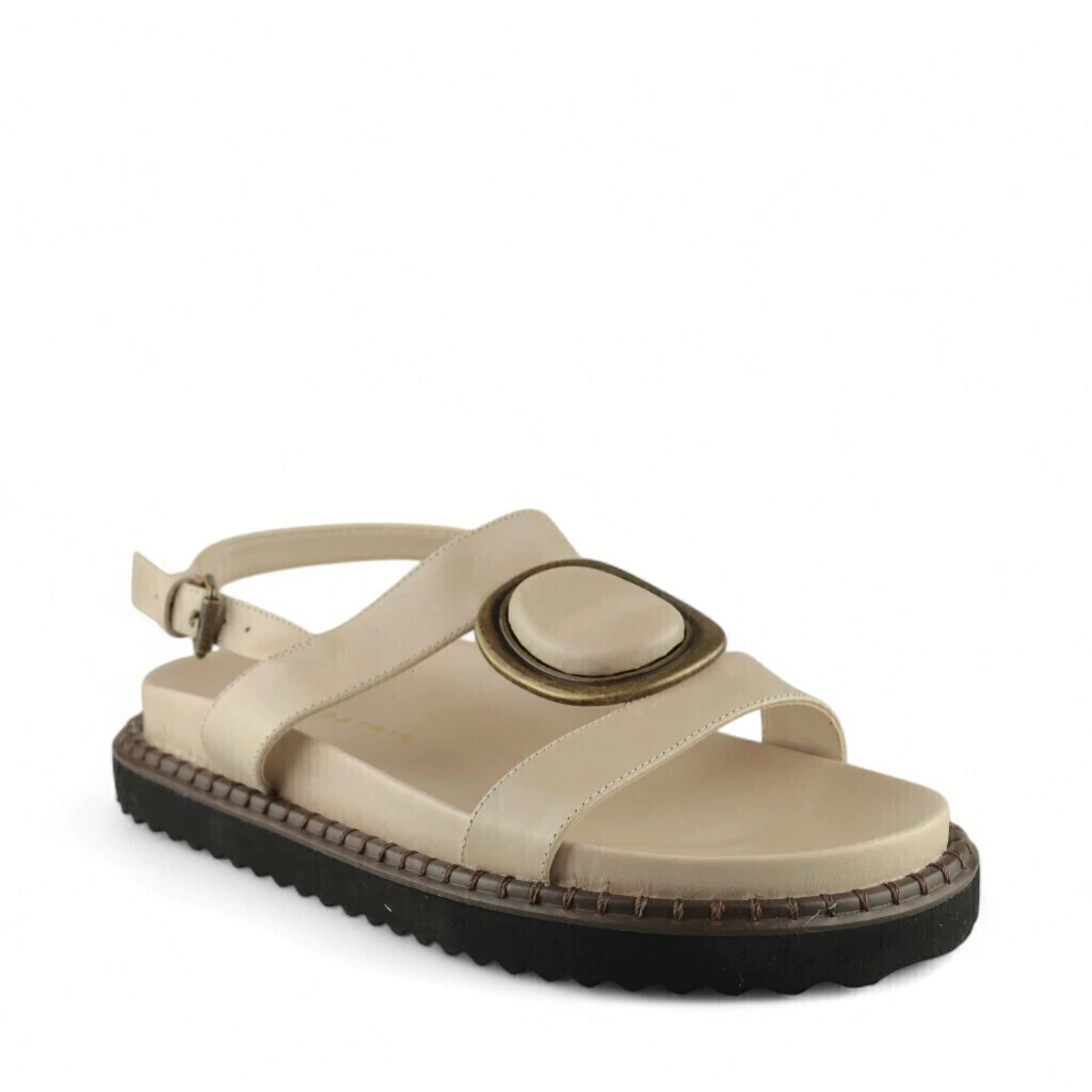 DESCRIÇAO: A imagem exibe uma sandália feminina de estilo casual, em tom bege claro. O design apresenta tiras que cruzam sobre o pé, garantindo um ajuste confortável. No centro, há um detalhe redondo em metal, que adiciona um toque de sofisticação ao calçado. A sandália possui uma sola grossa e texturizada, proporcionando conforto e estabilidade ao caminhar. A alça no calcanhar é ajustável, permitindo um melhor encaixe. Este modelo é ideal para dias quentes, combinando estilo e praticidade.