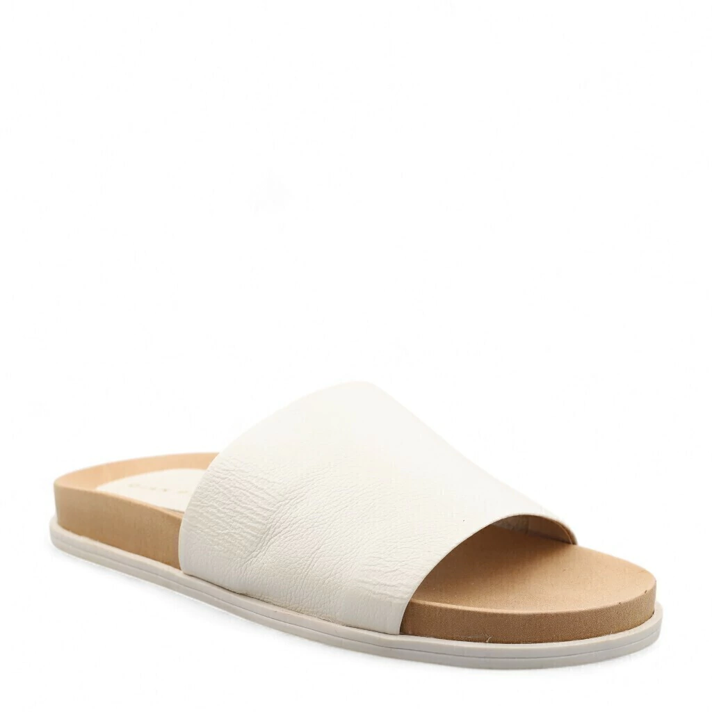 Descrição: A imagem mostra um slide na cor branca. O design é simples e elegante, com uma tira larga cobrindo a parte frontal do pé. A sola é plana e possui um tom neutro, oferecendo conforto. Este modelo é ideal para uso casual em ambientes descontraídos, combinando um visual clean e minimalista.