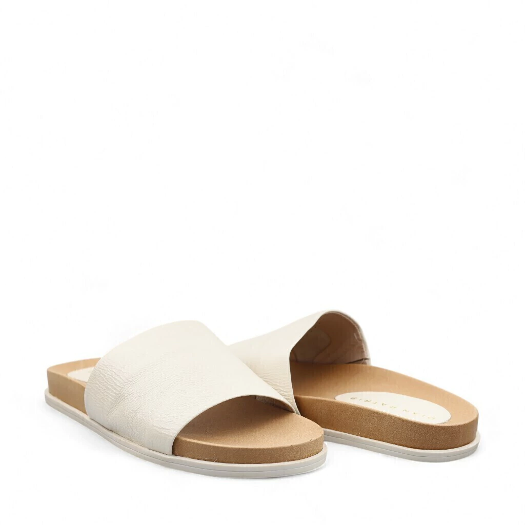 Descrição: A imagem mostra um slide na cor branca. O design é simples e elegante, com uma tira larga cobrindo a parte frontal do pé. A sola é plana e possui um tom neutro, oferecendo conforto. Este modelo é ideal para uso casual em ambientes descontraídos, combinando um visual clean e minimalista.