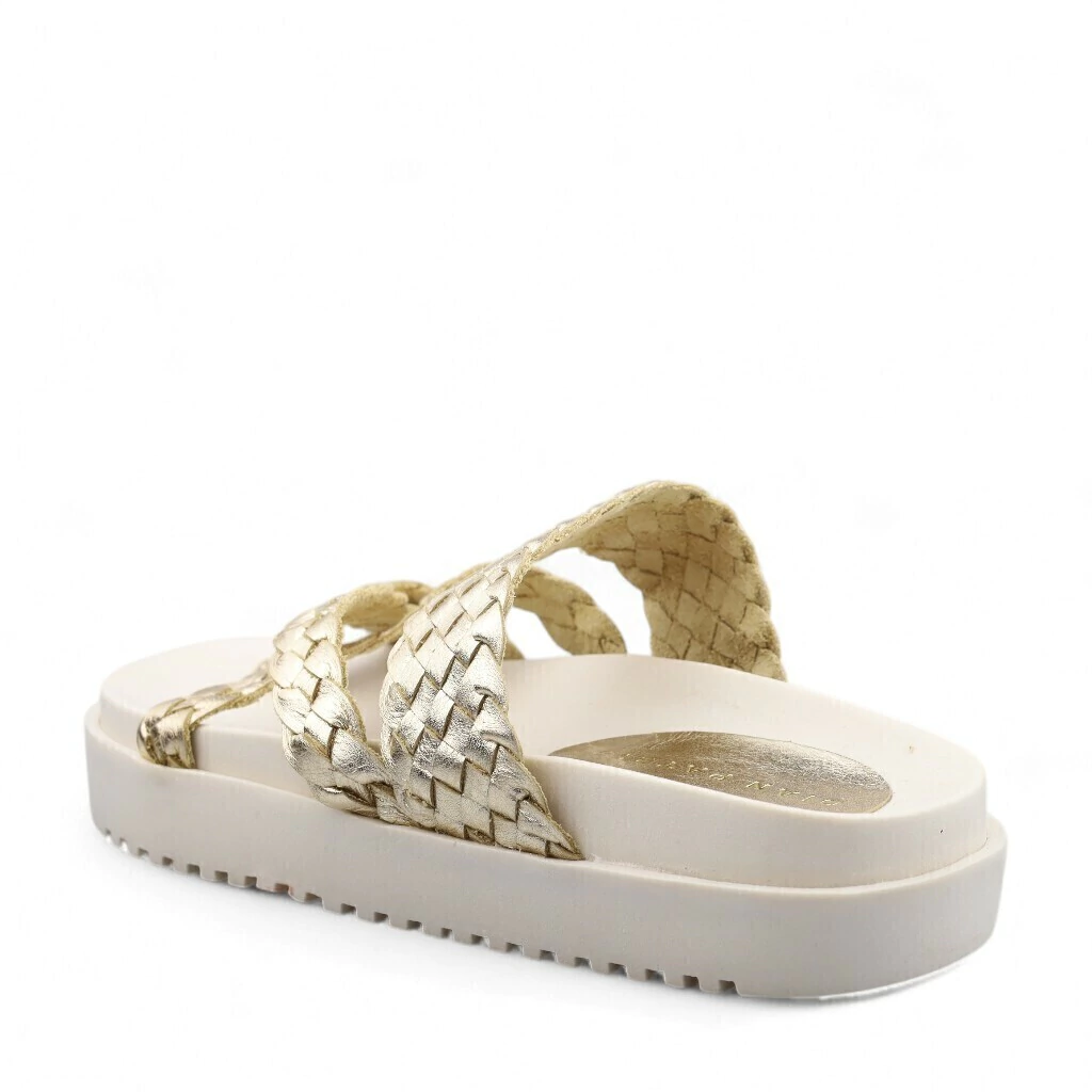 Descrição: A imagem mostra uma sandália de plataforma na cor dourada com tiras trançadas. O design é casual e moderno, com duas tiras largas entrelaçadas que oferecem um visual texturizado e interessante. A sola é espessa e possui uma textura antiderrapante, garantindo conforto e segurança. Ideal para uso diário em dias quentes, combinando estilo e praticidade de forma elegante.