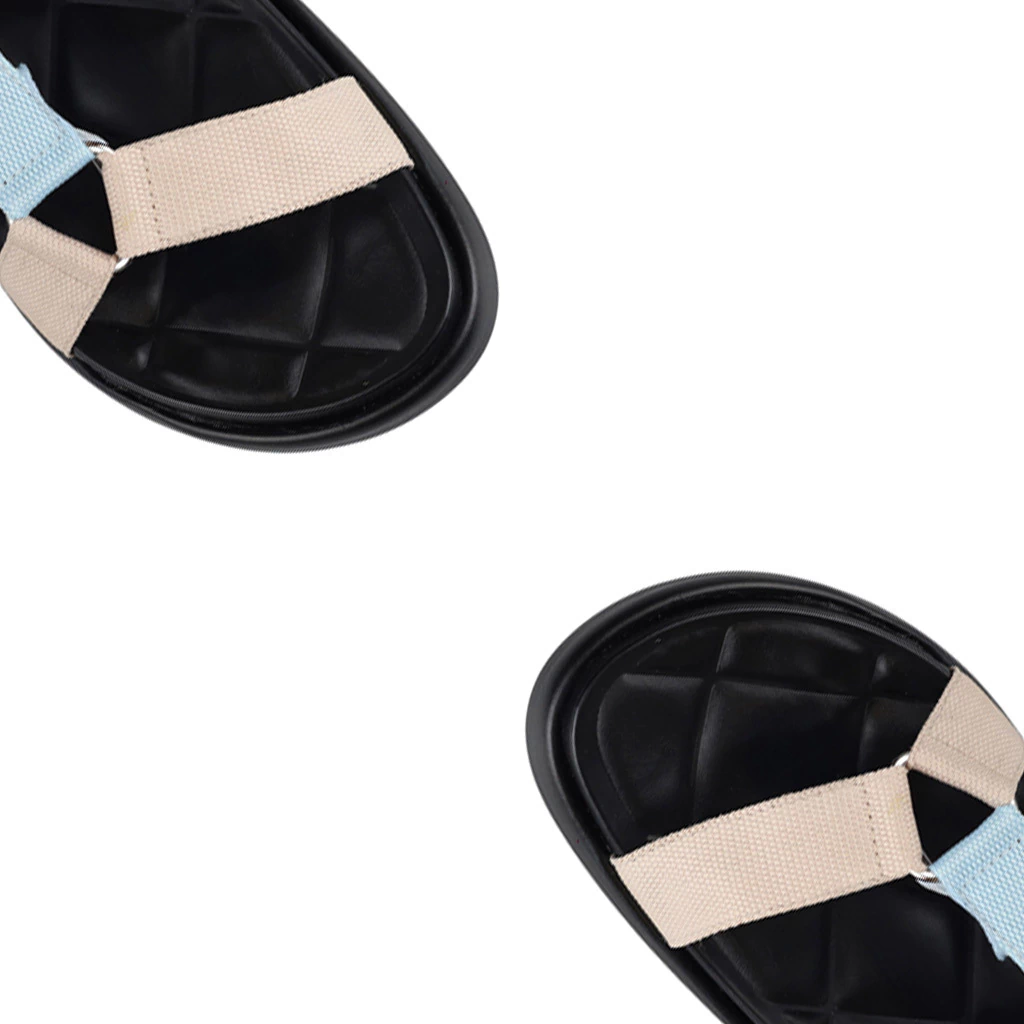 As sandálias apresentam um design moderno e colorido, com tiras em tons de azul, bege e laranja. As tiras são feitas de material elástico, proporcionando conforto e um bom ajuste. O modelo é aberto, com uma sola preta robusta, ideal para uso casual e atividades ao ar livre. Essas sandálias são perfeitas para adicionar um toque divertido e descontraído ao visual.