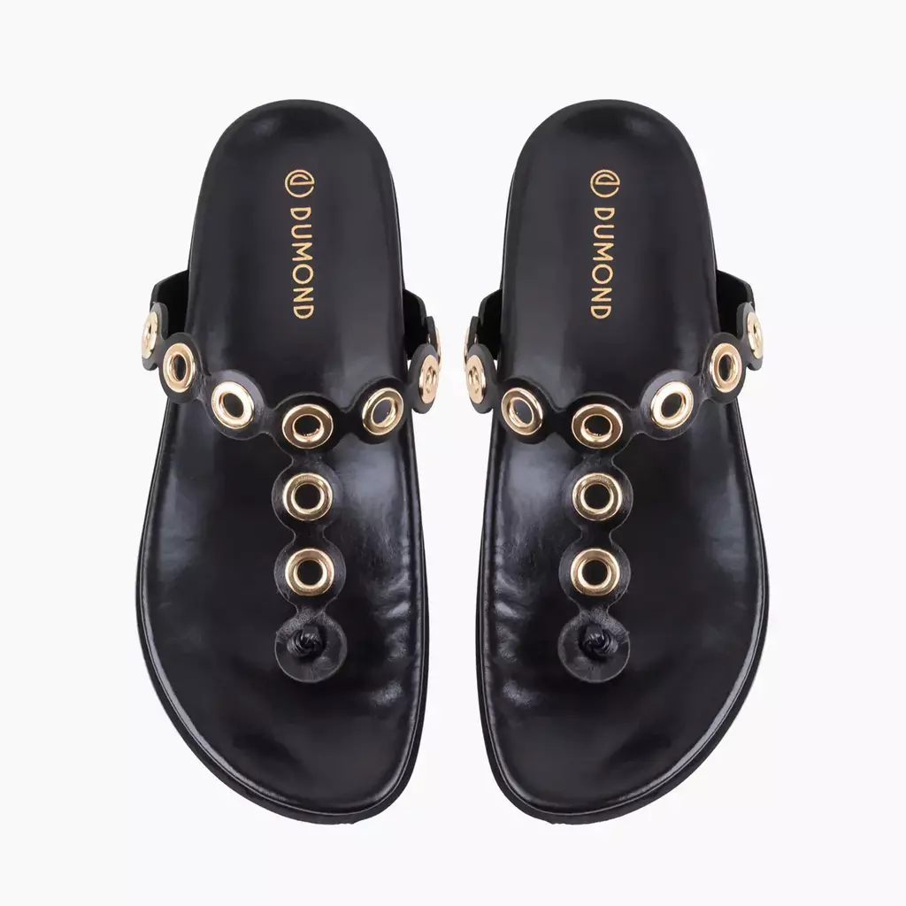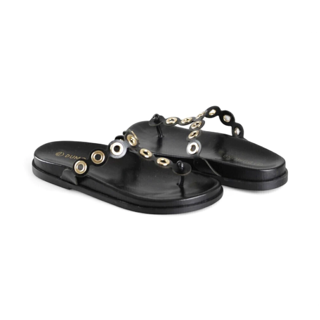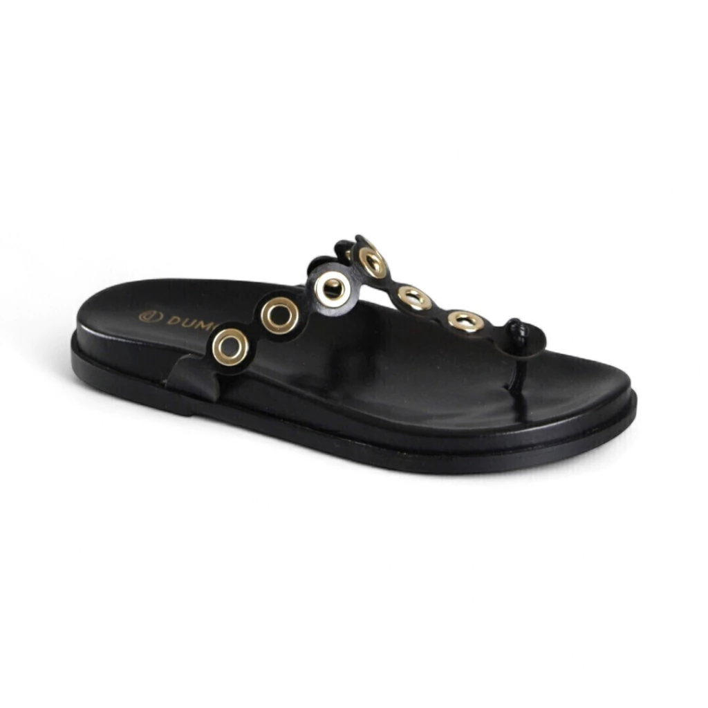 DESCRIÇÃO: Rasteira preta com design minimalista e tiras decoradas por ilhós metálicos dourados. Possui formato anatômico, palmilha confortável e solado baixo, unindo praticidade e estilo para compor looks modernos e elegantes nos dias quentes.