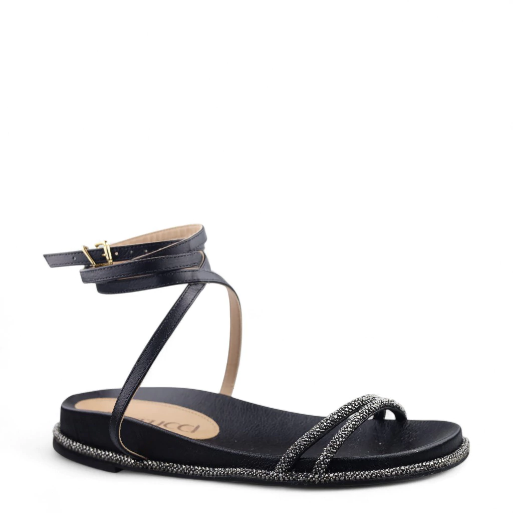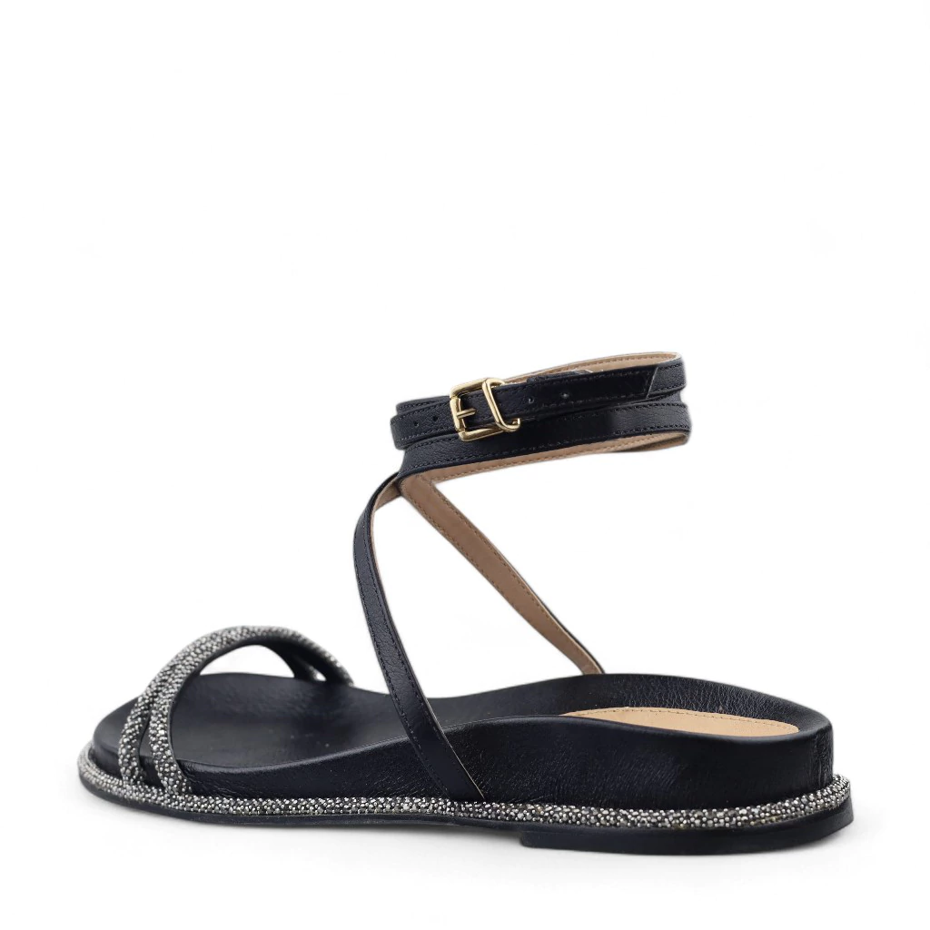 DESCRIÇÃO: A imagem apresenta uma sandália flat em um tom preto elegante, com um design minimalista e moderno. As tiras são finas, com um formato que se entrelaça delicadamente sobre o pé e uma tira ajustável no tornozelo, garantindo um encaixe seguro.