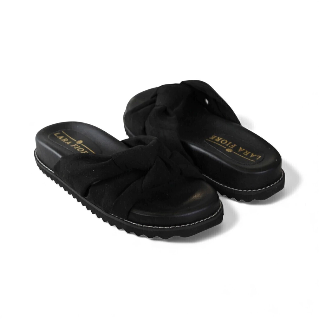 DESCRIÇAO: Papete feminina preta com parte superior em tecido macio formando um nó torcido sobre o peito do pé. Palmilha acolchoada em tom preto, sola de borracha com frisos/serrilhados e detalhe de costura contrastante na borda. Visual casual, confortável e moderno.