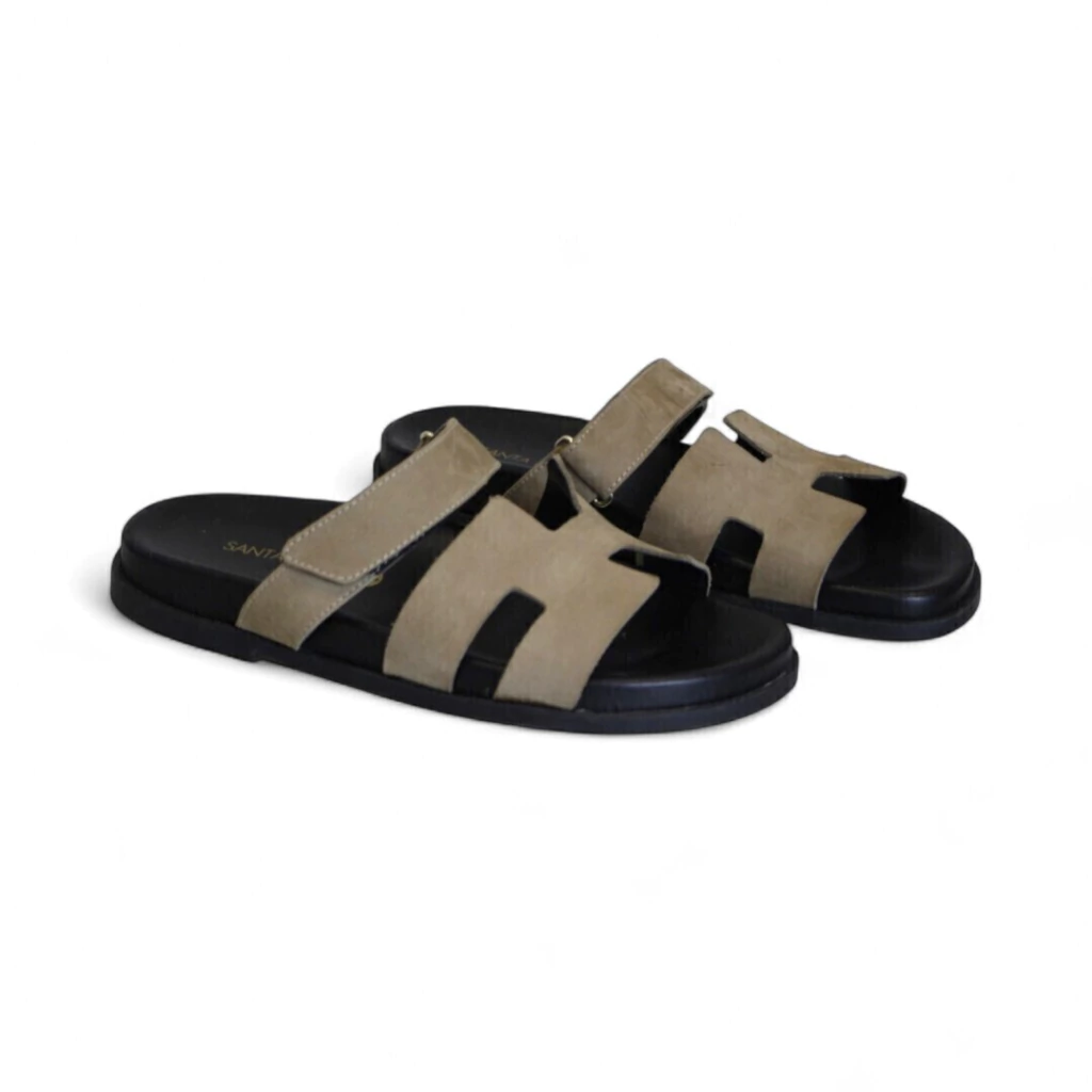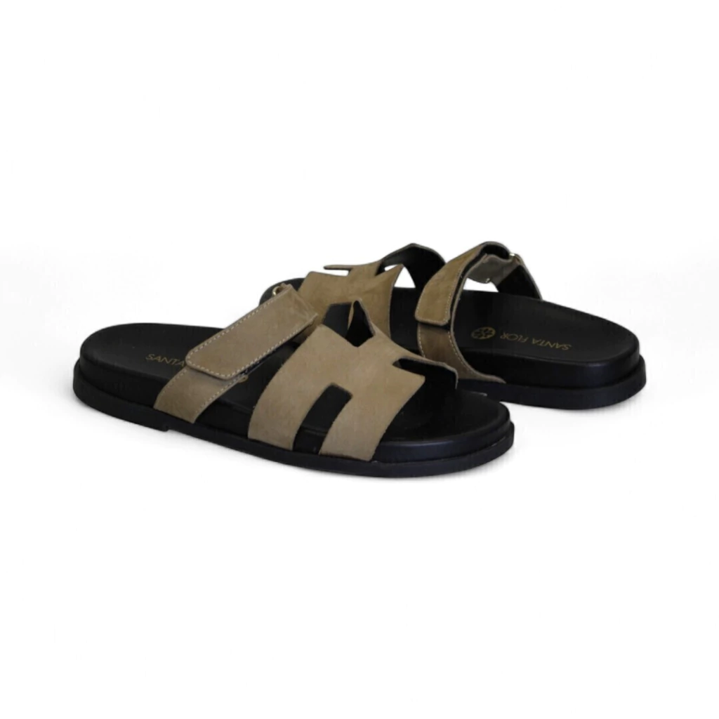 DESCRIÇÃO:Papete slide feminina em tom bege claro com cabedal em camurça sintética composto por duas tiras largas frontais com recortes geométricos e uma tira superior ajustável com fecho em velcro. Palmilha preta levemente acolchoada com marca dourada, solado baixo em borracha preta. Visual confortável, casual e versátil.