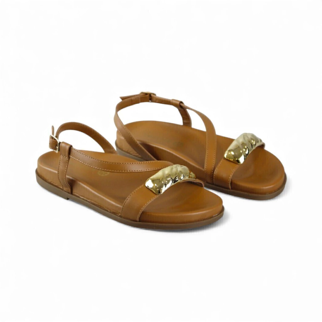 DESCRIÇÃO: Papete slide feminina caramelo/tan com palmilha levemente acolchoada, tira frontal larga com aplique metálico dourado irregular, alça slingback ajustável com fivela dourada e solado baixo e plano.