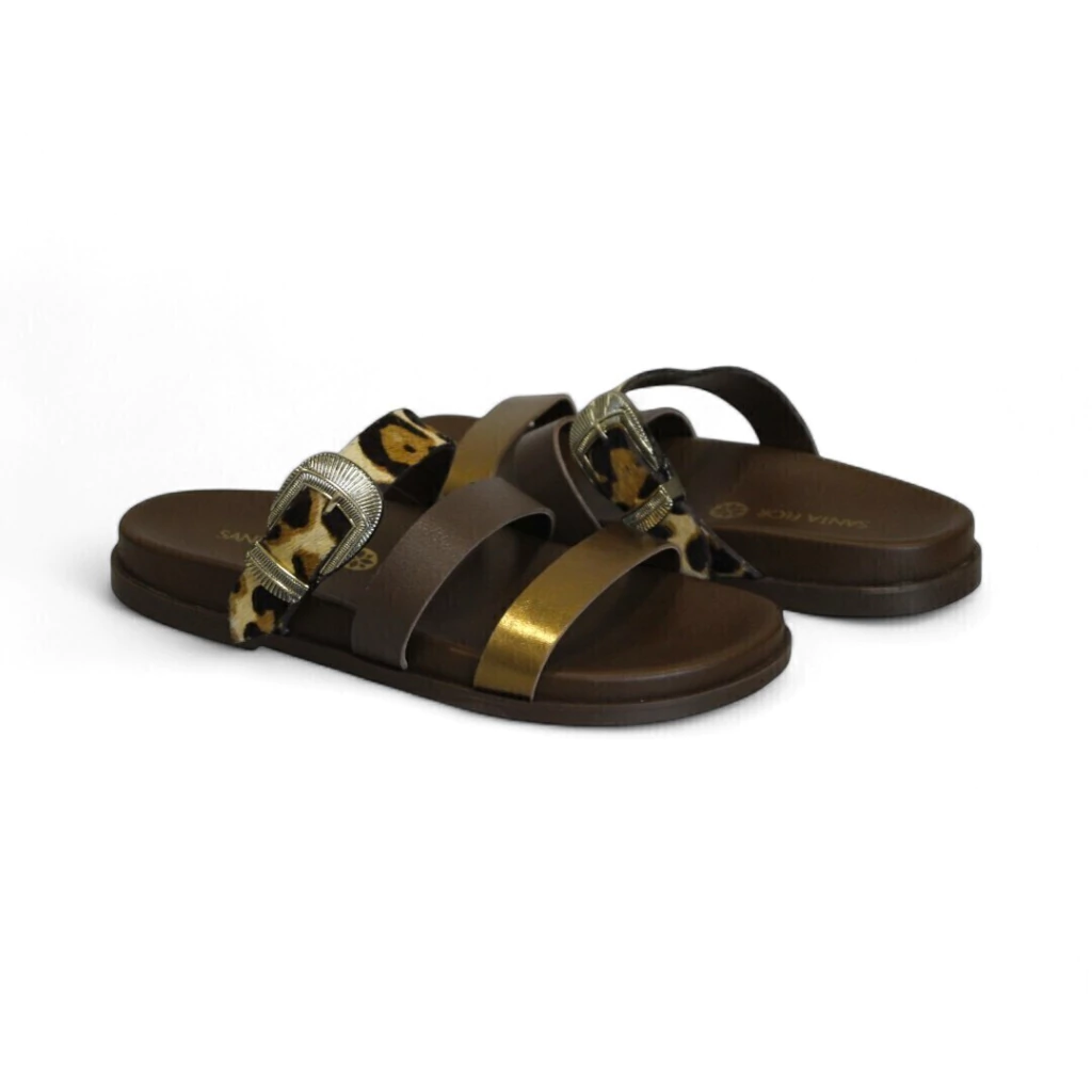 DESCRIÇÃO:Papete feminina slide com três tiras frontais: uma tirinha estampada animal print com fivela grande prateada decorativa na parte externa, uma tira marrom lisa e uma tira metálica dourada. Palmilha e solado em tons de marrom, perfil baixo e visual casual-chic com detalhe animal que dá destaque.