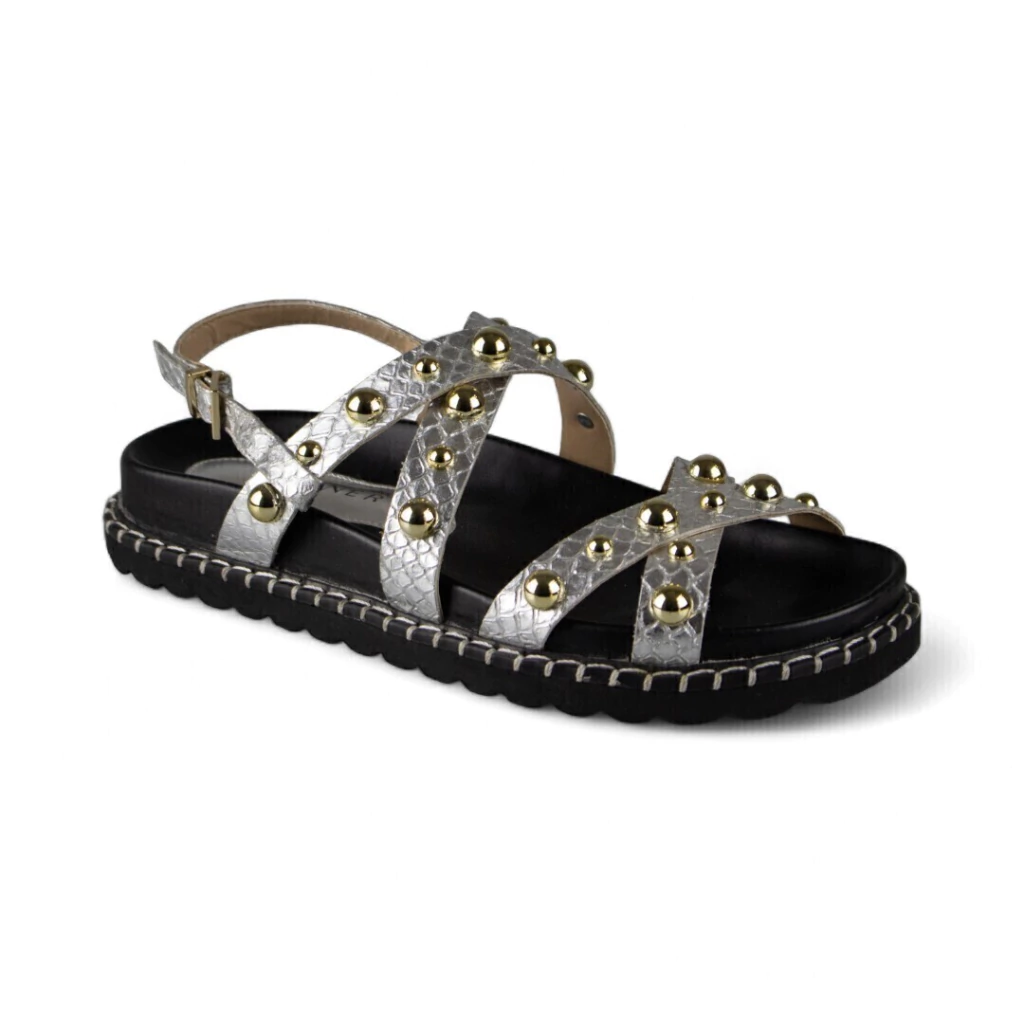 DESCRIÇÃO: Essa sandália é moderna e cheia de personalidade, com acabamento prateado que adiciona brilho e estilo ao visual. O design apresenta tiras cruzadas com textura de cobra e aplicação de esferas metálicas douradas, criando um contraste elegante e contemporâneo. A palmilha preta com solado robusto garante conforto e um toque urbano, ideal para composições despojadas e sofisticadas.