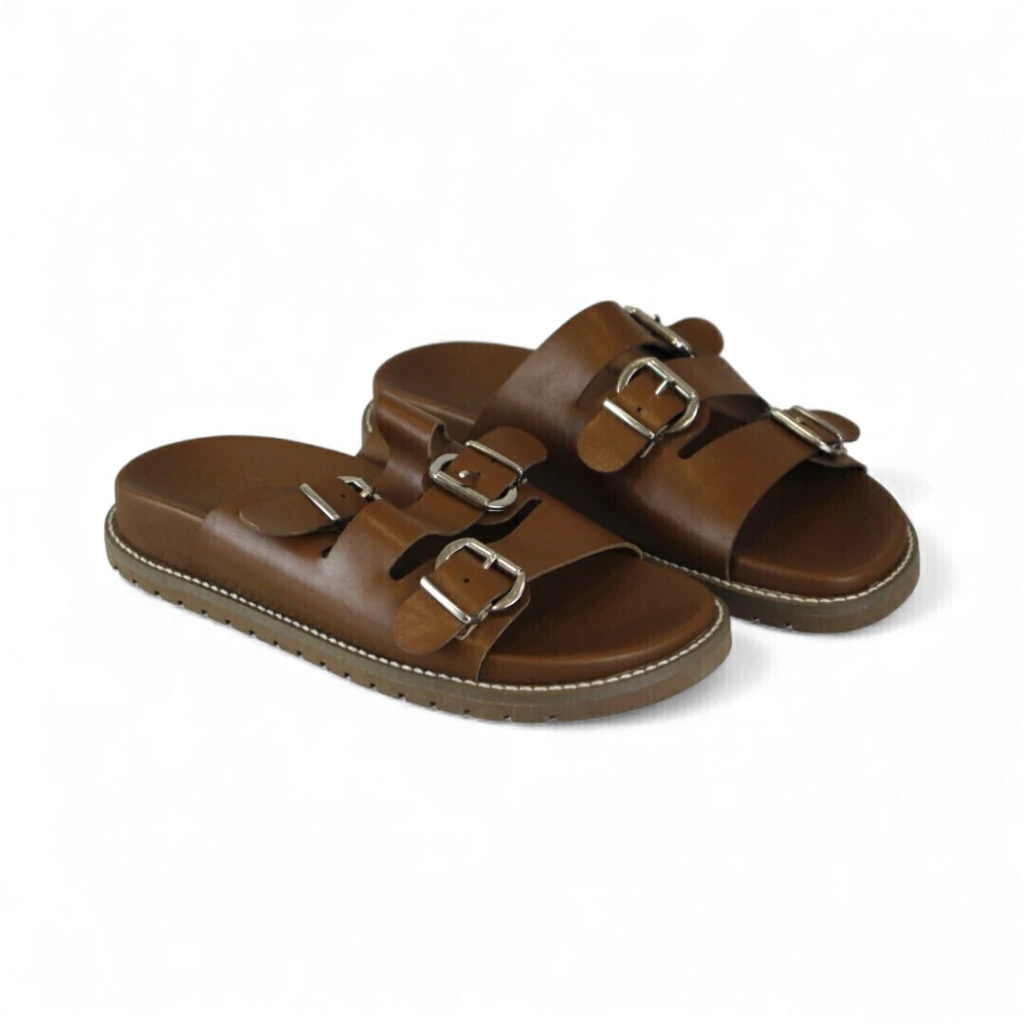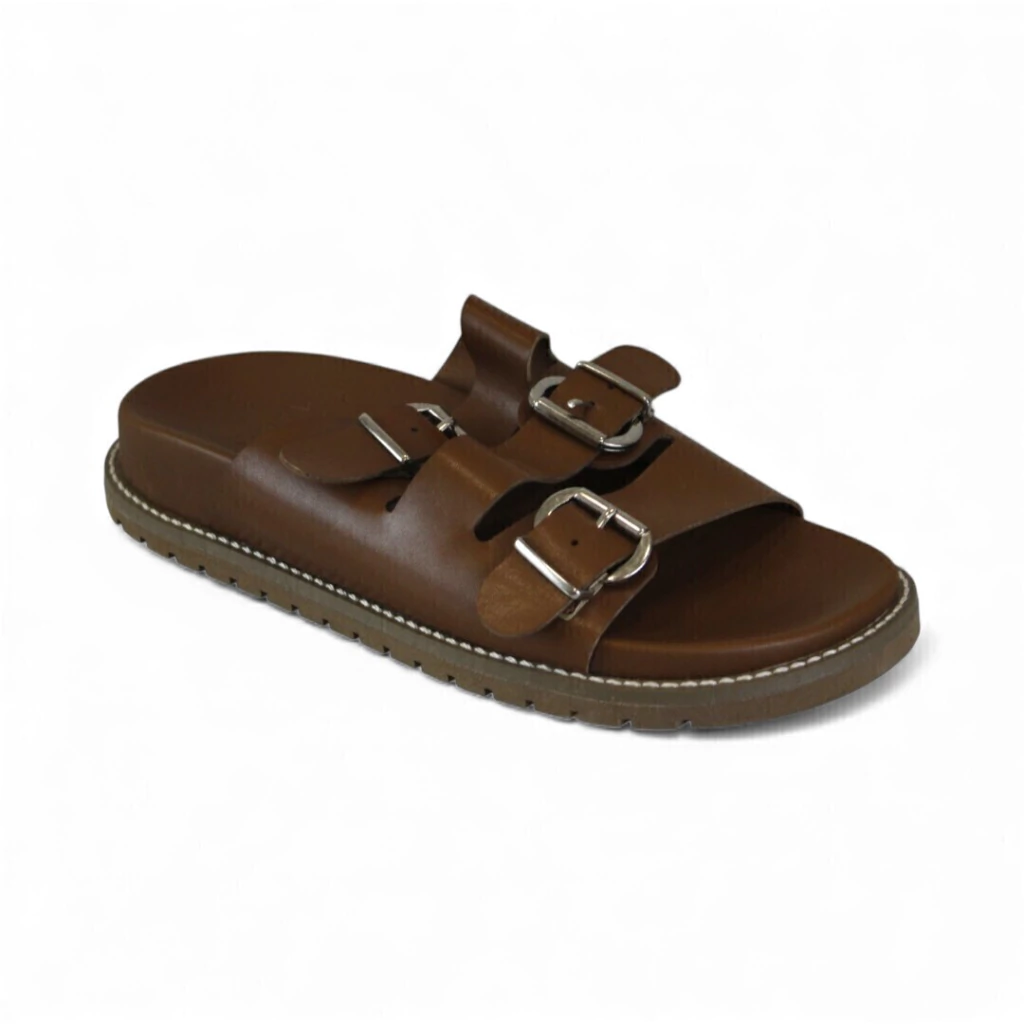 DESCRIÇÃO: Papete tom marrom caramelo com palmilha anatômica levemente acolchoada. Cabedal com duas tiras largas sobre o peito do pé, cada uma ajustável por fivela metálica prateada. Sola de borracha com costura aparente branca na cintura e frisos antiderrapantes na base. Visual casual, robusto e confortável.