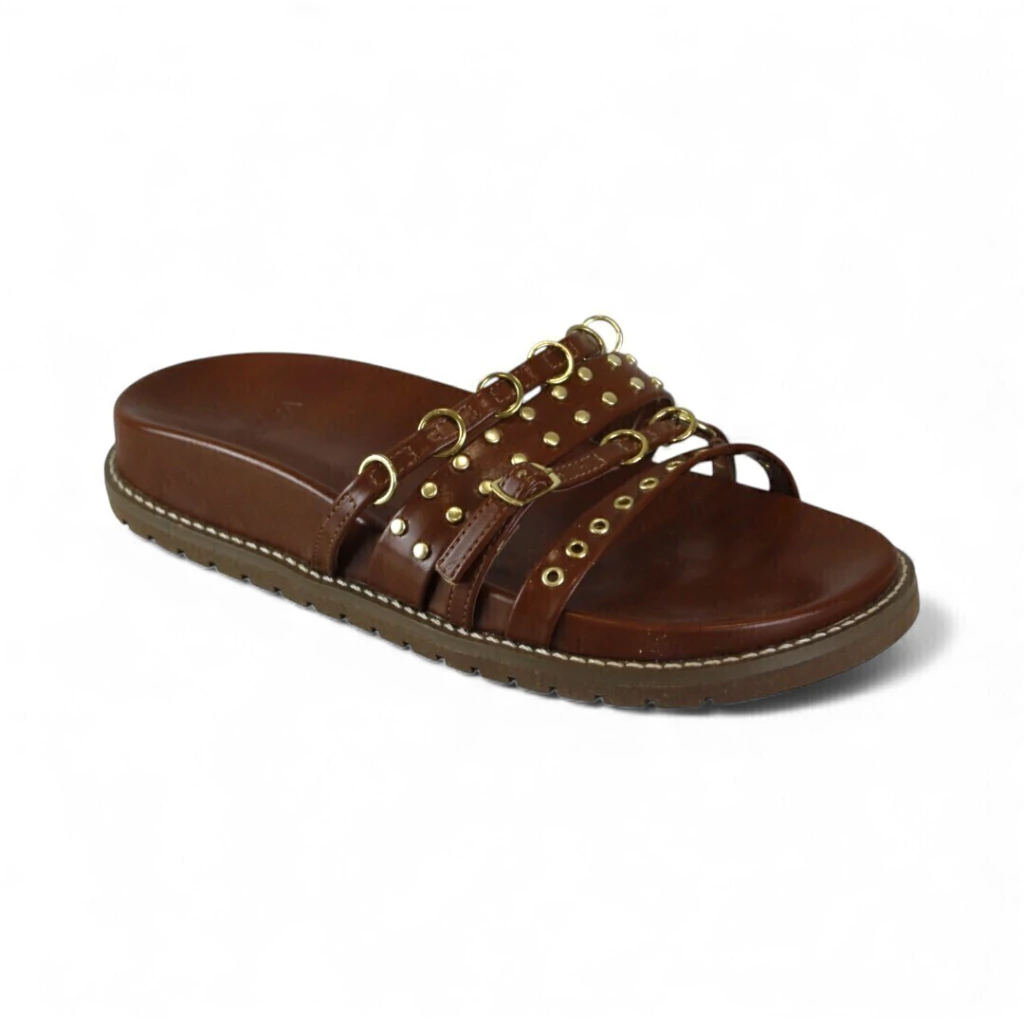 DESCRIÇÃO: Papete em tom marrom caramelo com palmilha levemente acolchoada e sola de borracha com costura aparente branca na cintura. Cabedal composto por várias tiras finas e médias decoradas com ilhoses e tachas douradas e pequenos anéis metálicos; detalhe de mini fivela decorativa. Visual urbano e com toque rocker/estilizado.