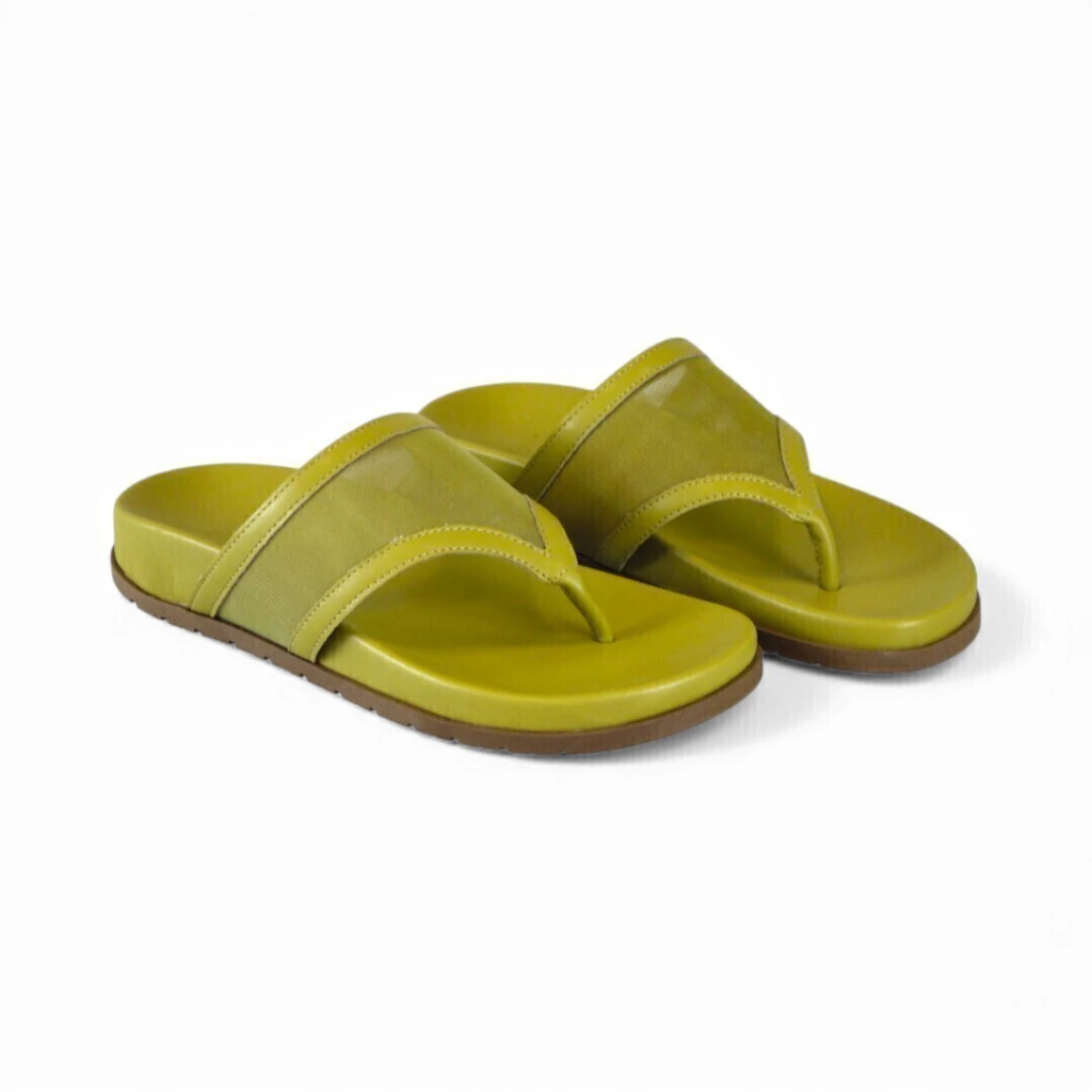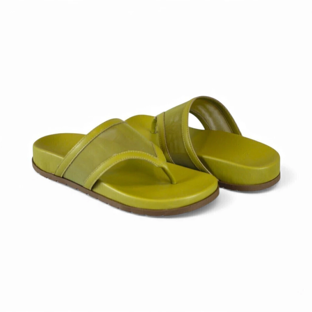 DESCRIÇÃO: Chinelo tipo flip-flop/slide em tom verde-oliva/mostarda claro. Pedestal com palmilha anatômica levemente elevada e sola externa marrom. Cabedal composto por tira central tipo “havaiana” com sobreposição larga em tecido mesh e acabamento em material sintético nas bordas. Visual casual, confortável e esportivo.