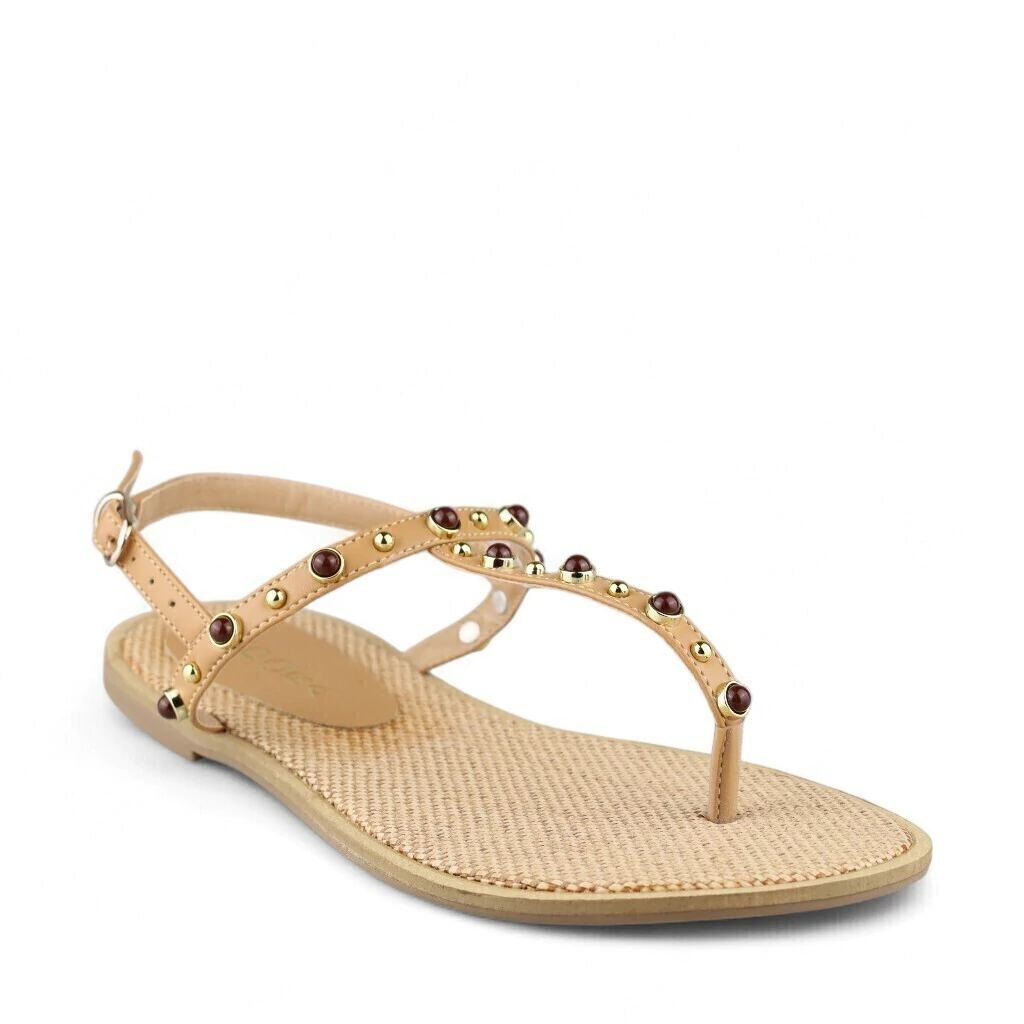 Descrição: A imagem mostra um par de sandálias rasteiras em um tom nude, com um design delicado e atraente. As tiras são finas e entrelaçadas, decoradas com pequenos studs dourados e pedras em tom vinho, que adicionam um toque de sofisticação. A tira no tornozelo é ajustável, proporcionando um encaixe confortável e seguro.