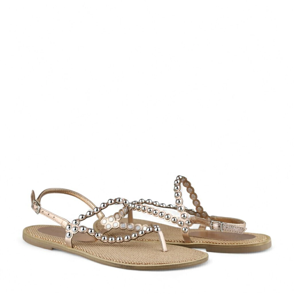 Descrição: A imagem apresenta sandálias rasteiras em um tom nude, com detalhes decorativos em metal prateado. O design é elegante, com tiras finas que se entrelaçam, criando um efeito delicado. As esferas metálicas adicionam um toque de brilho e sofisticação. A tira no calcanhar é ajustável, proporcionando conforto e um bom encaixe. Essas sandálias são perfeitas para looks casuais e de verão, refletindo um estilo leve e moderno.