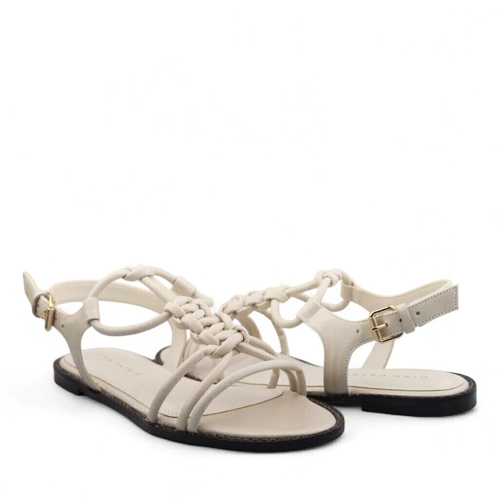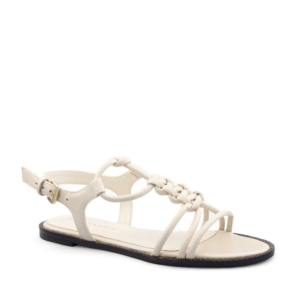 Descrição: A imagem mostra uma sandália rasteira em tom claro, com um design elegante e delicado. As tiras são finas, com uma seção central trançada que cria um visual interessante. A sandália possui uma tira que envolve o tornozelo, com um fecho que permite um ajuste seguro. O solado é plano e levemente escuro, proporcionando contraste com a parte superior clara. O estilo minimalista e as linhas suaves fazem dessa sandália uma escolha versátil e perfeita para o uso em dias quentes. O fundo branco destaca a leveza e a sofisticação do modelo.