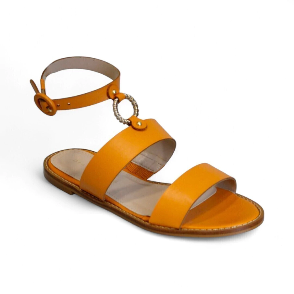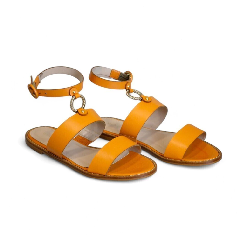 DESCRIÇÃO: A imagem apresenta uma sandália rasteira em tom laranja com design moderno e elegante. O modelo possui duas tiras largas sobre o peito do pé e uma tira no tornozelo com fechamento por fivela ajustável. O destaque fica por conta do detalhe em argola metálica dourada com textura trançada, que adiciona charme e sofisticação ao visual. O solado baixo com acabamento natural proporciona conforto e praticidade, tornando essa sandália uma escolha versátil e estilosa para compor looks leves e descontraídos.