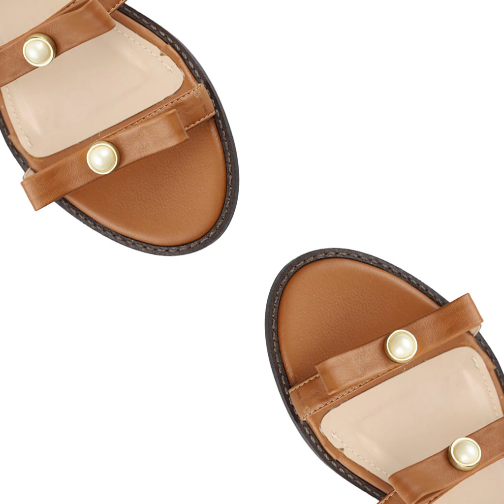 Rasteira super estilosa em couro. Na com marrom, possui detalhes em pérolas trazendo um charme especial para o calçado! O estilo gladiador dá ainda mais glamour ao produto!