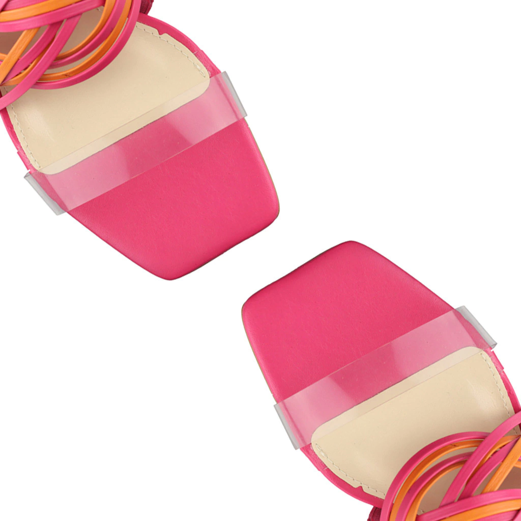 rasteira com um design vibrante e moderno. O modelo destaca-se por suas tiras largas em tons de rosa e laranja, que se cruzam de maneira estilizada, criando um efeito visual dinâmico. A parte frontal possui uma tira transparente, que traz leveza ao visual. A sola é plana, proporcionando conforto e facilidade de uso, ideal para o dia a dia ou ocasiões informais.