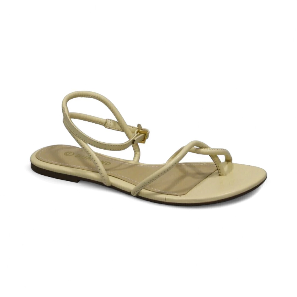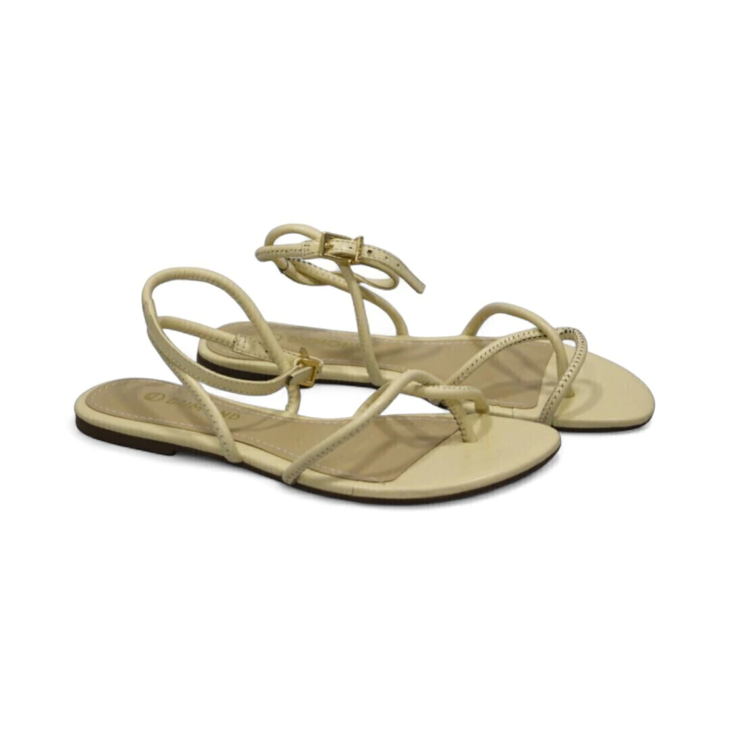 DESCRIÇÃO: A imagem mostra uma rasteira feminina da marca Dumond, em tom bege claro. O modelo possui tiras finas e arredondadas que formam um design moderno e minimalista, com fechamento lateral por fivela dourada ajustável. A palmilha levemente acolchoada e o bico quadrado garantem conforto e estilo.