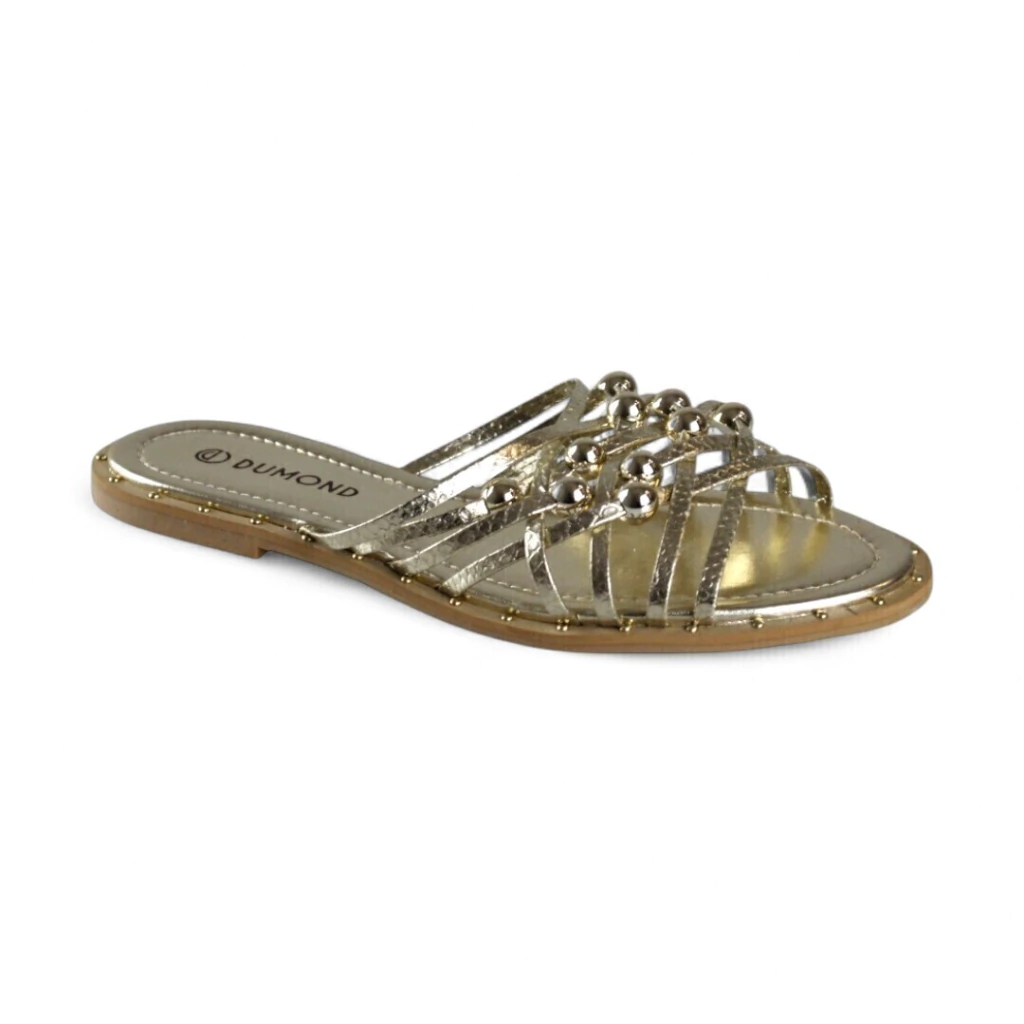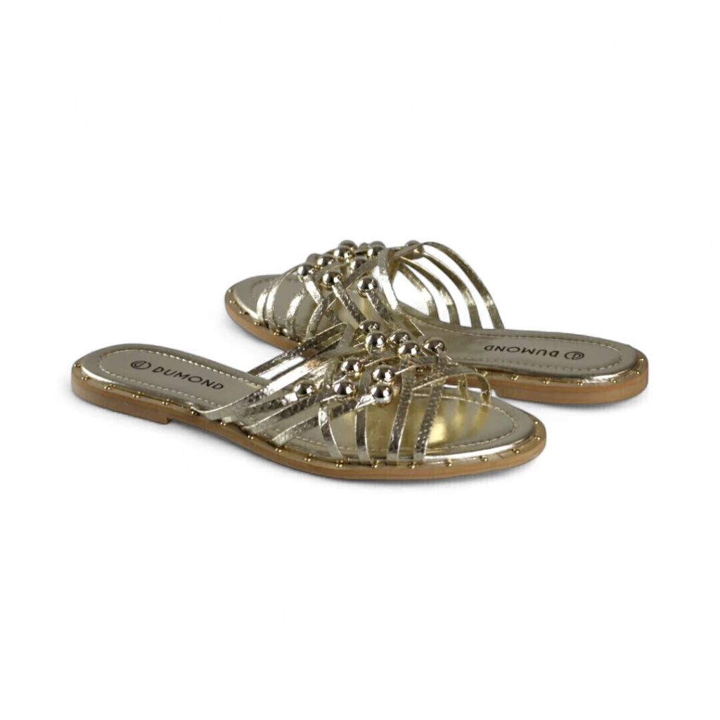 DESCRIÇÃO: Rasteira dourada com tiras finas e aplicação de esferas metálicas na parte superior. Possui acabamento metalizado e solado baixo com detalhe de tachas nas bordas, garantindo um visual moderno e sofisticado com toque de brilho.