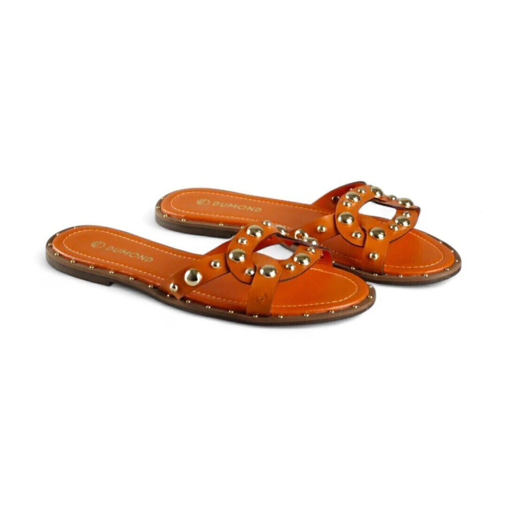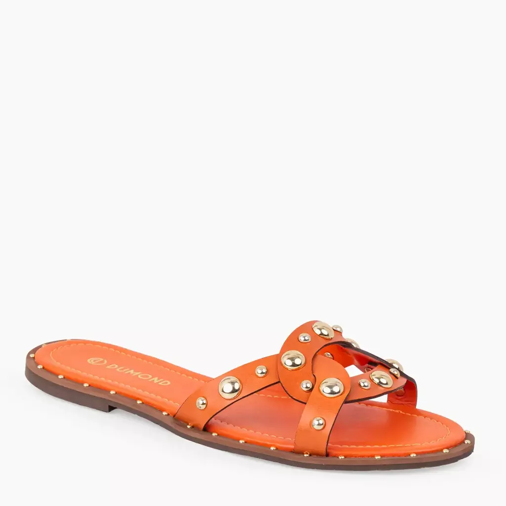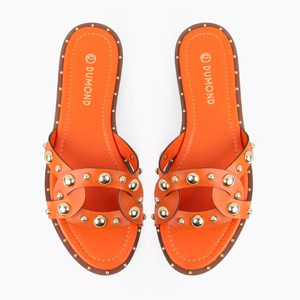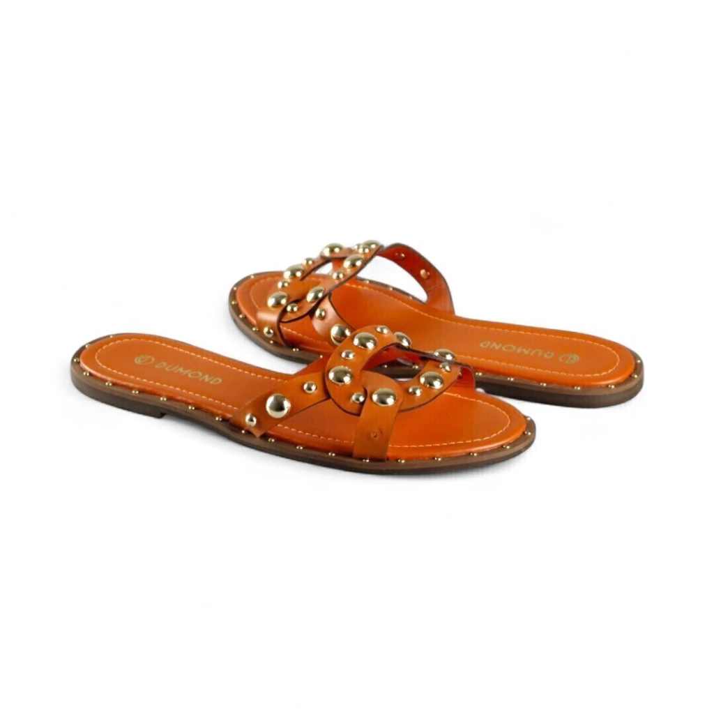 DESCRIÇÃO: Rasteira laranja com tiras cruzadas e aplicação de tachas douradas. Possui acabamento liso, palmilha macia e solado baixo com detalhe de metais ao redor, unindo conforto e estilo em um visual moderno e sofisticado.