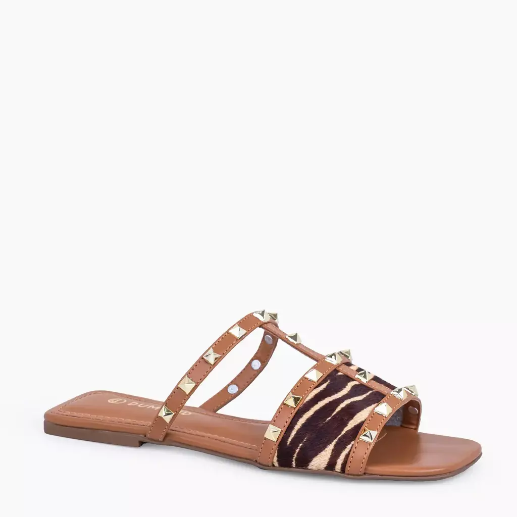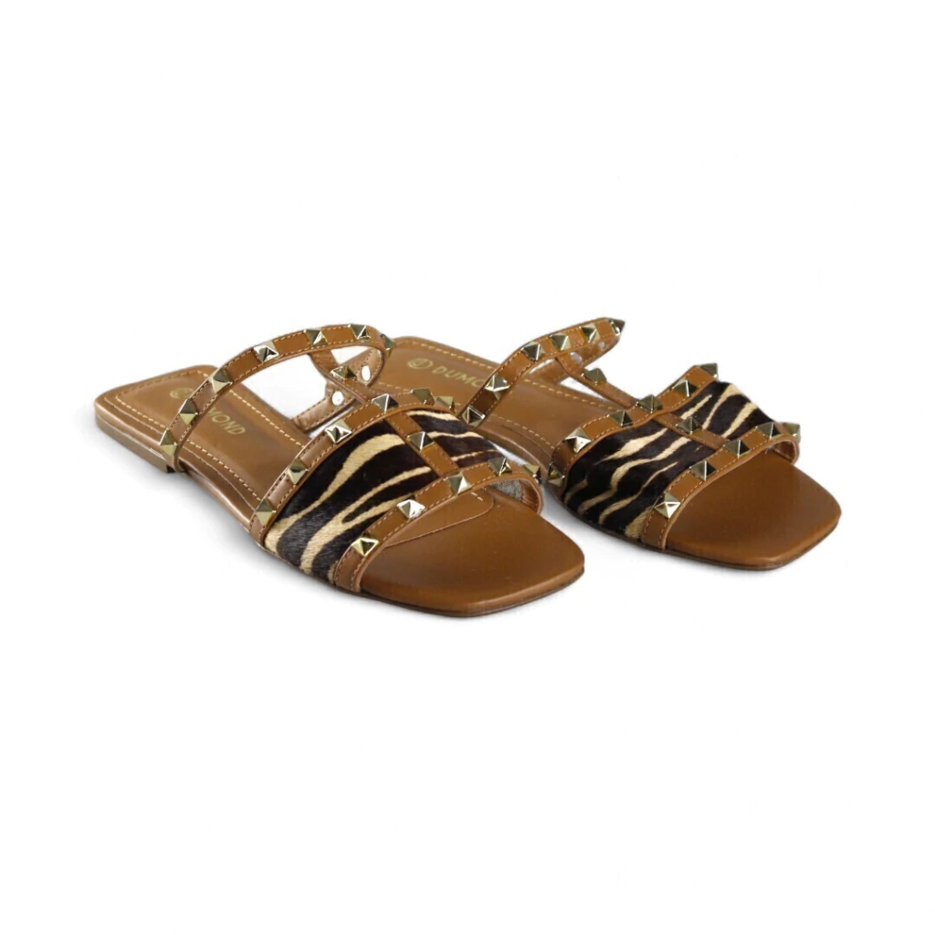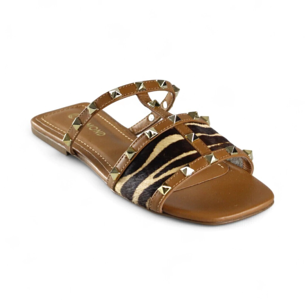 DESCRIÇÃO: Essa rasteira marrom é um modelo cheio de personalidade e estilo. As tiras finas, adornadas com aplicações de tachas douradas, trazem um toque moderno e sofisticado ao visual. O destaque fica por conta da faixa central com estampa animal print, que adiciona ousadia e elegância na medida certa. Com palmilha confortável e solado flat, é perfeita para produções casuais com um toque fashion — ideal para quem busca conforto sem abrir mão do charme.