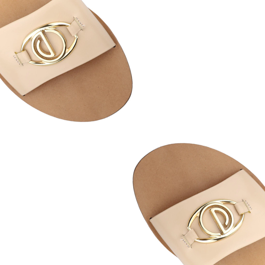 A parte superior é larga e possui um detalhe em metal dourado, que traz um toque de sofisticação e estilo. O design aberto permite fácil calce e conforto, enquanto o solado é plano, garantindo suporte durante o uso.