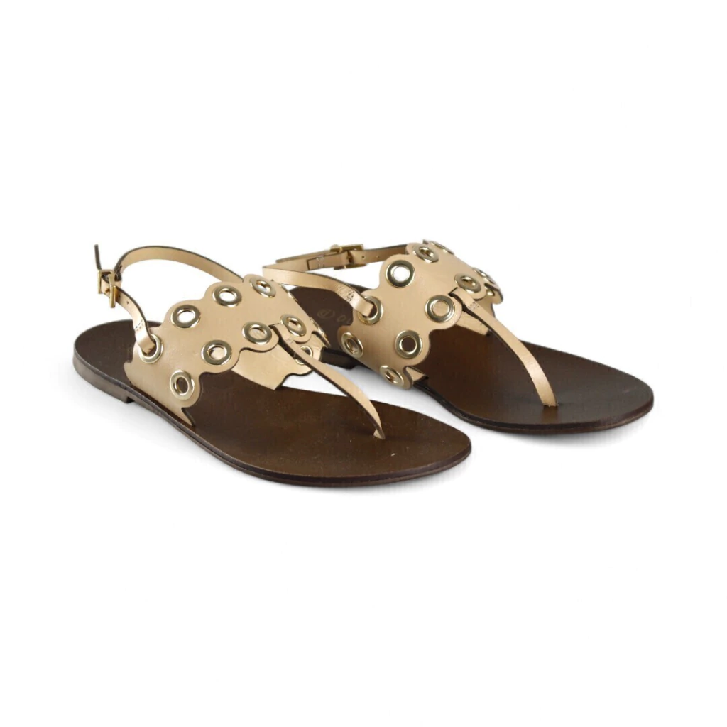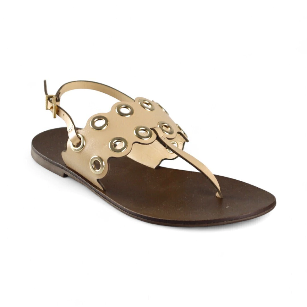DESCRIÇÃO: Essa rasteira nude é elegante e moderna, ideal para compor looks sofisticados com conforto. O modelo em formato de T conta com uma pala recortada decorada por ilhoses metálicos dourados, que trazem um toque contemporâneo e cheio de estilo. O fechamento lateral com fivela oferece praticidade e melhor ajuste aos pés, enquanto o solado flat garante conforto no dia a dia. Versátil e charmosa, combina facilmente com produções casuais ou mais arrumadas.